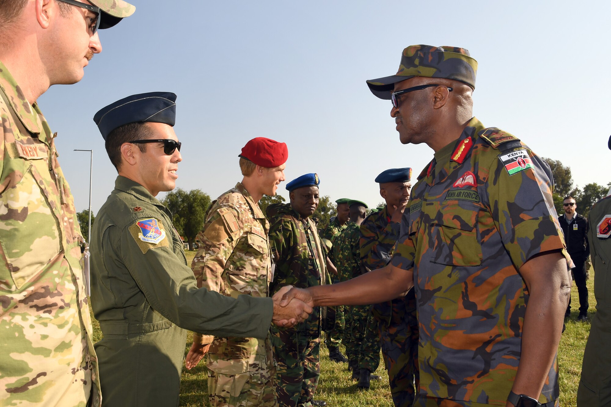 Maj. Anibal Aguirre, U.S. Air Forces in Europe and Air Forces Africa personnel recovery coordination cell director, shakes hands with Maj. Gen. Francis C. Ogolla, commander of the Kenya air force, following the opening ceremony for African Partnership Flight Kenya 2019 at Laikipia Air Base, Kenya, August 20, 2019. This iteration of APF is focused on personnel recovery covering topics such as tactical combat casualty care, survival and evasion and combat search and rescue tactics, techniques and procedures. (U.S. Air Force photo by Master Sgt. Renae Pittman)