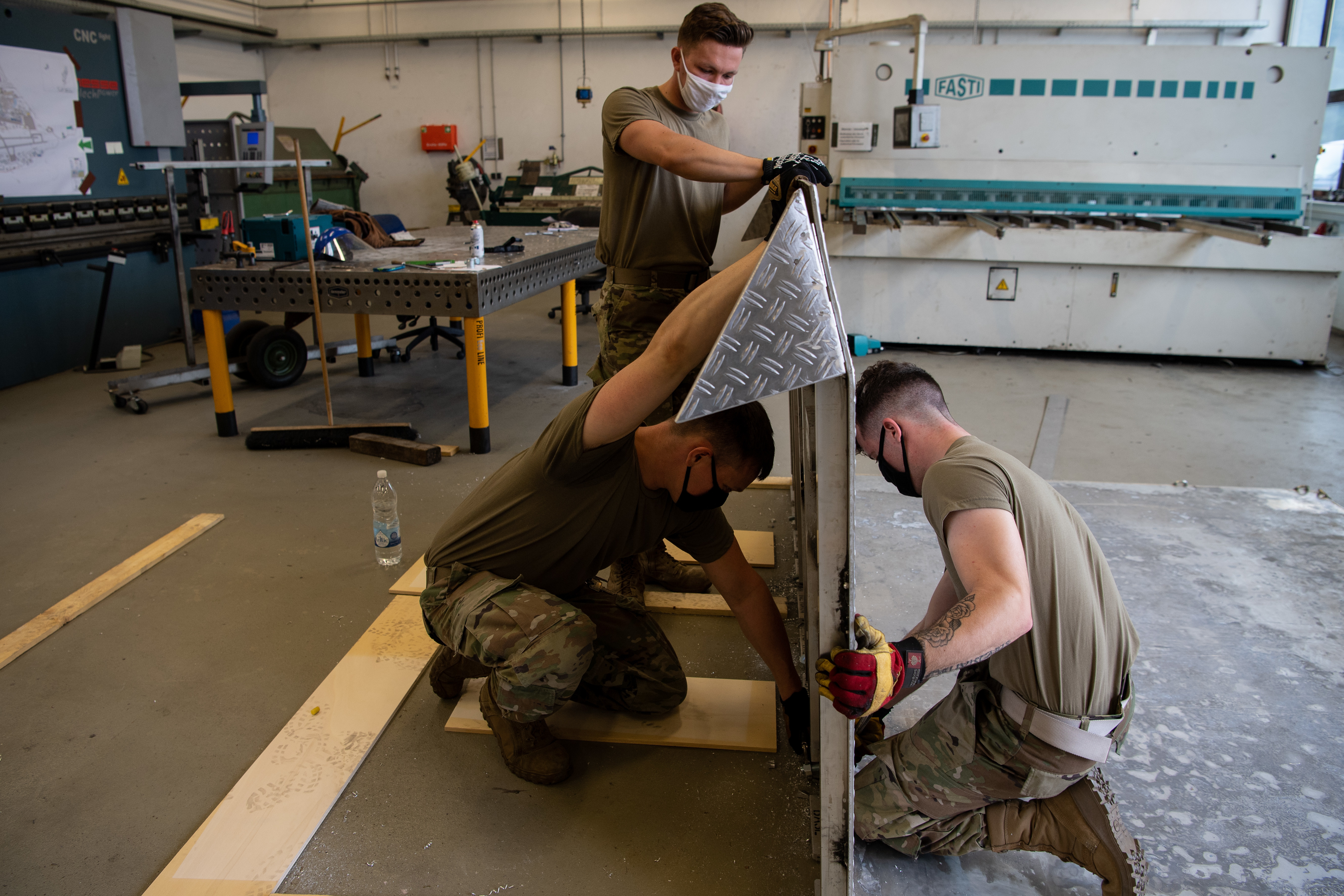 Senior Airman Dyllan Greer, Airman 1st Class Tyler Sellitto, Airman 1st Class Austen Campbell, and local national Thomas Spies, have been working diligently to calculate and construct ramps fabricated from aluminum diamond-plated metal, in order to smoothly load BCUs such as a Negatively Pressurized Conex for the 10th Expeditionary Aeromedical Evacuation Flight’s COVID-19 mission.