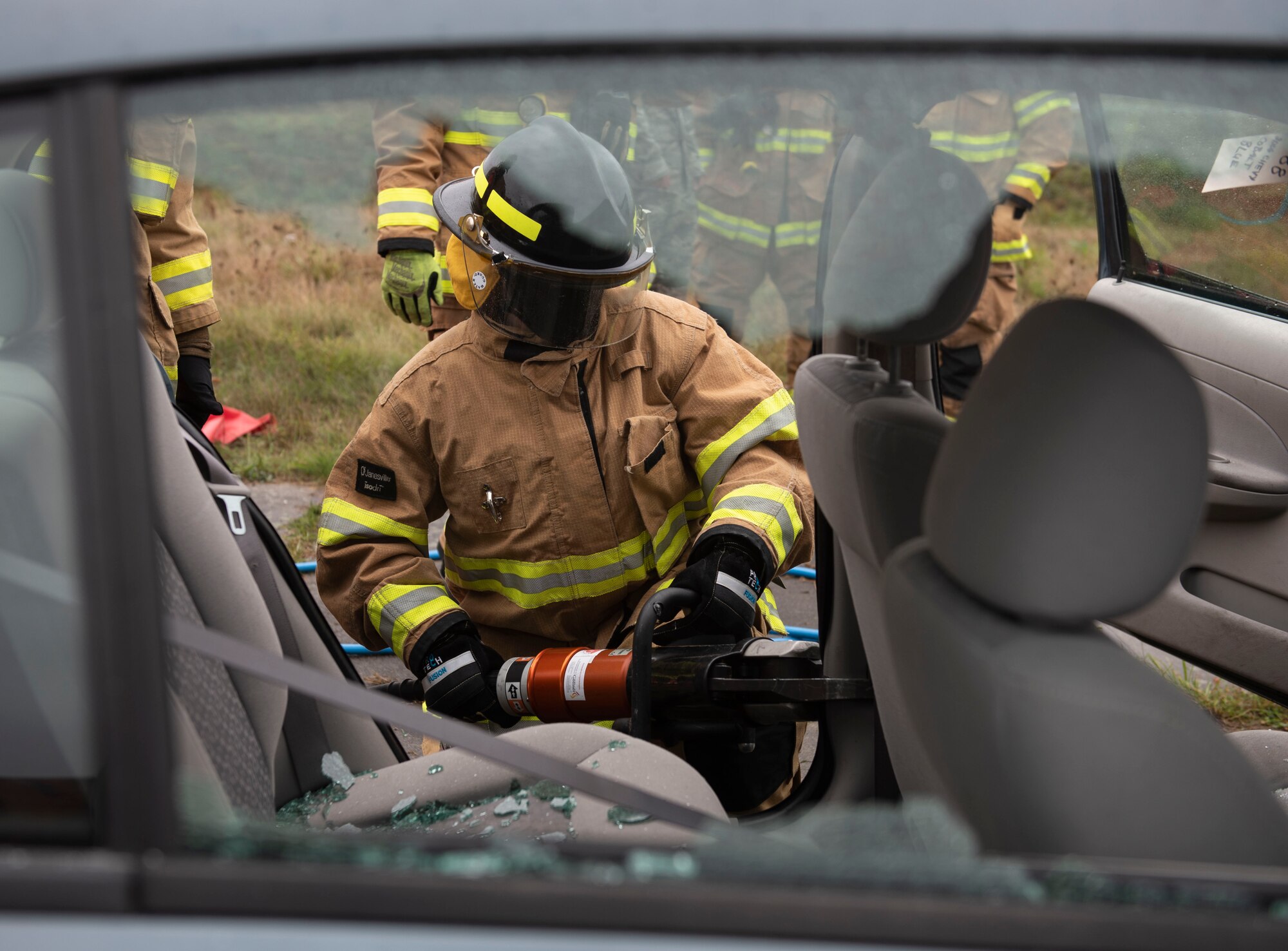 U.S. Air Force Airman 1st Class Andre Korte, left, and A1C Nathaniel Corder, 52nd Civil Engineer Squadron Fire and Emergency Services firefighters, prepare for a building fire simulation, Oct. 5, 2020, at Spangdahlem Air Base, Germany. The Spangdahlem Fire Department demonstrated this simulator to 52nd Fighter Wing leadership during Fire Prevention Week, to showcase their capabilities and mission readiness in case of building fires. (U.S. Air Force photo by Senior Airman Melody W. Howley)