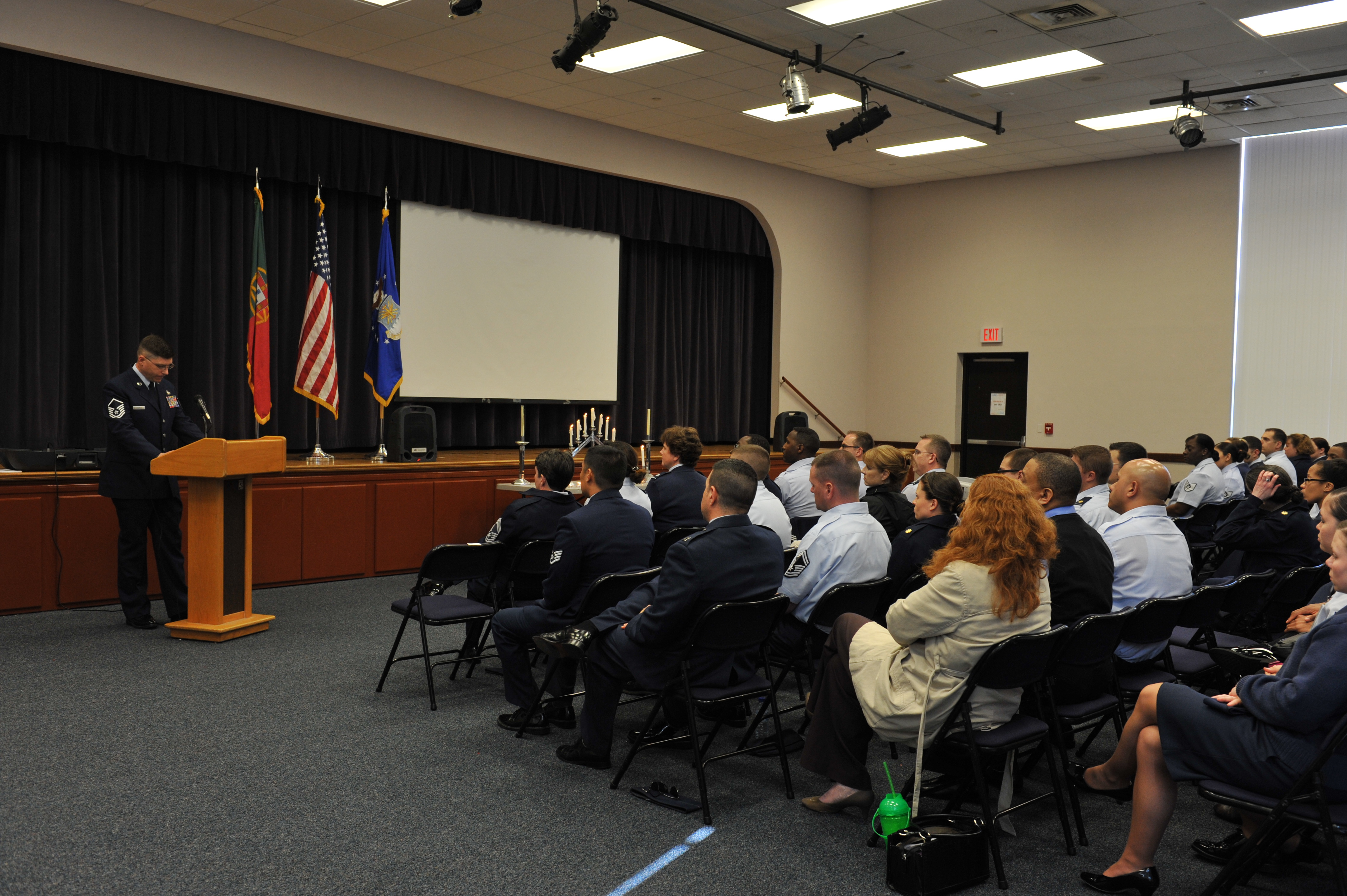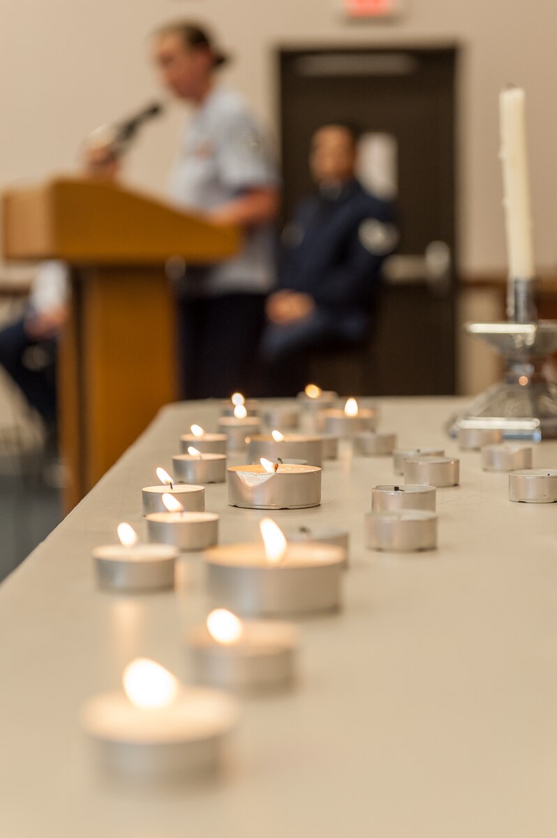 Staff Sgt. Angela Smith, 65th Medical Group, reads names of Holocaust victims during a name-reading and candle-light vigil held in conjunction with the National Holocaust Days of Remembrance at Lajes Field April 8. The 65th Air Base Wing held a formal ceremony commemorating the Holocaust, honoring the victims' memory and focusing on how Airmen stand against genocide and atrocities. This year's national theme is "Never Again - Heeding the Warning Signs." (U.S. Air Force photo by Lucas Silva/Released)
