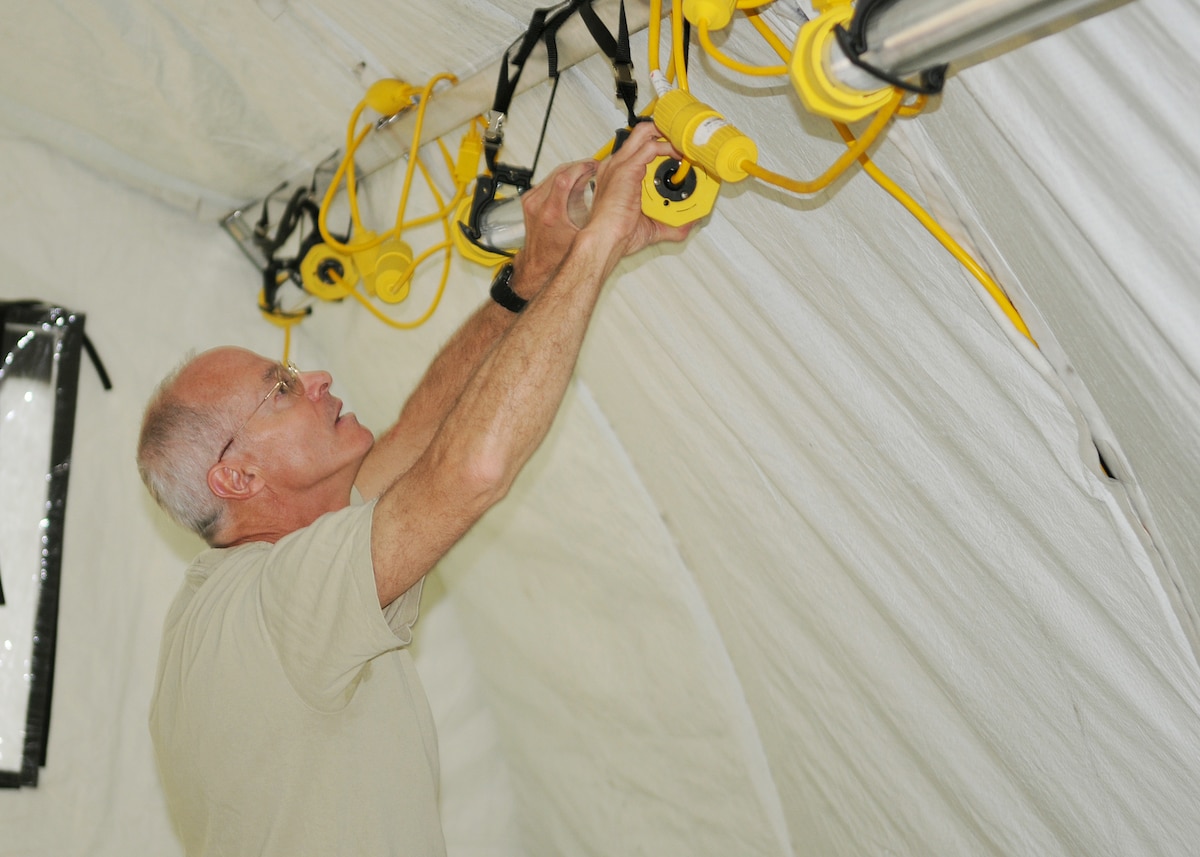 Lt. Col. Bill McConnell, a Baltimore native from the 153rd Airlift Group, Warfield Air National Guard Base, Md., secures lights inside an Alaskan tent during the Expeditionary Medical Support course here, May 30, 2012. During the course, instructors from Joint Base San Antonio, Texas, taught more than 50 U.S. military members how to set up and operate a medical facility in a deployed environment. More than 500 military members from nine nations are participating in SR12, an annual U.S. Joint Chiefs of Staff sponsored exercise, May 28 - June 8. The goals of the exercise are to strengthen interoperability, facilitate training in crisis response and disaster management, and validate the readiness of deployable military medical and humanitarian assistance teams. The exercise, in the spirit of partnership for peace, directly supports U.S. European Command's theater cooperation efforts and strategy for active security with European countries.