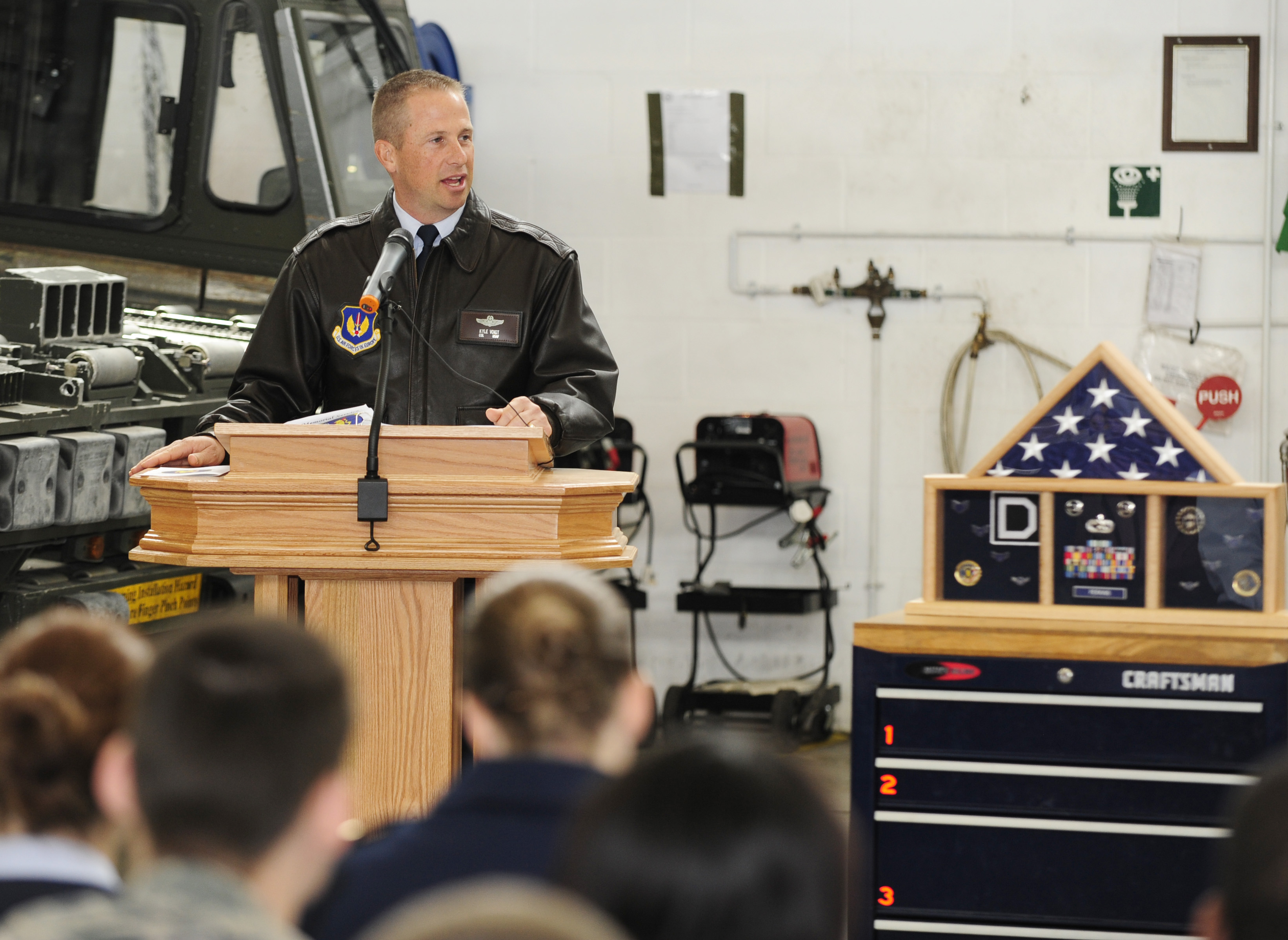 ROYAL AIR FORCE MILDENHALL, England – Col. Kyle Voigt, 100th Air Refueling Wing vice commander, gives his closing remarks during a memorial ceremony for Staff Sgt Thomas Perkins here May 7, 2012. The memorial was held to celebrate the life of Perkins and to give his friend and families the chance to express what he meant to them. (U.S. Air Force photo/Senior Airman Ethan Morgan)