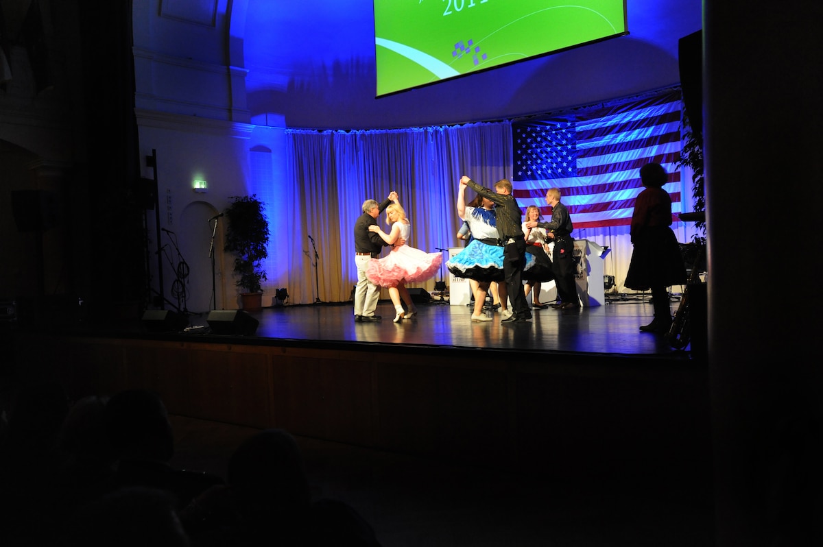 Stefanie Tücking, regional radio station SWR3, thanks Andrea Oliver, Stadtwerke Kaiserslautern, for her coordination of the ‘Year of Internationality’ event, Kaiserslautern, Germany, Nov.16, 2011. During the event individuals from the U.S. were given the opportunity to present information and share personal stories about their respective country to the local community. (Air Force photo by Airman 1st Class Caitlin O’Neil-McKeown)