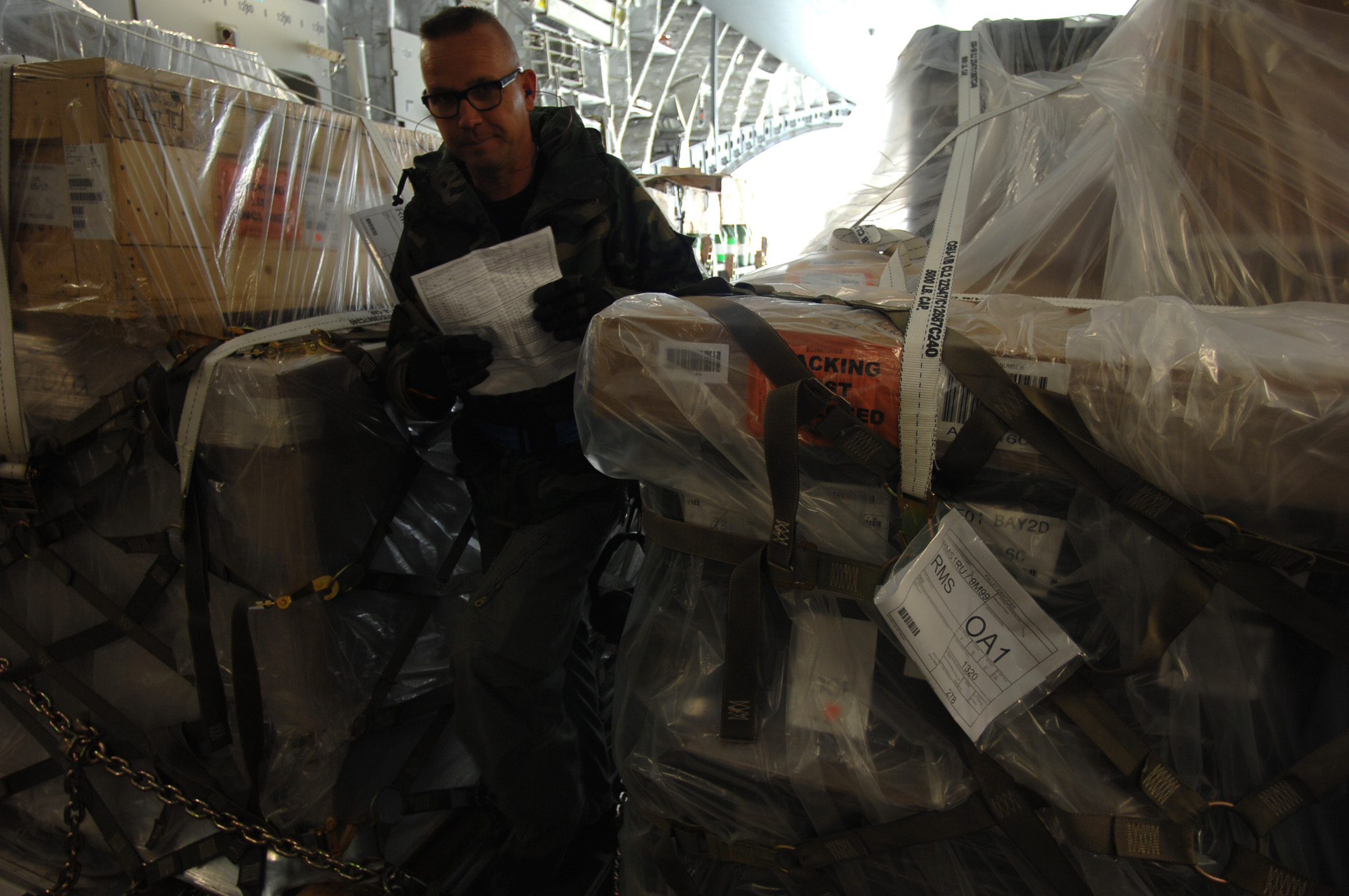 Kasper Chevalier, 721st Aerial Port Squadron aerial porter checks over the cargo after being loaded into a C-17, Globemaster III. Recently Mr. Chevalier became the first Air Force civilian to reach 500 APEX missions. The APEX program allows select air transportation personnel to obtain qualifications similar to aircraft loadmasters, enabling a shorter on the ground time for loadcrews. (U.S. Air Force photo by Tech. Sgt. Michael Voss)