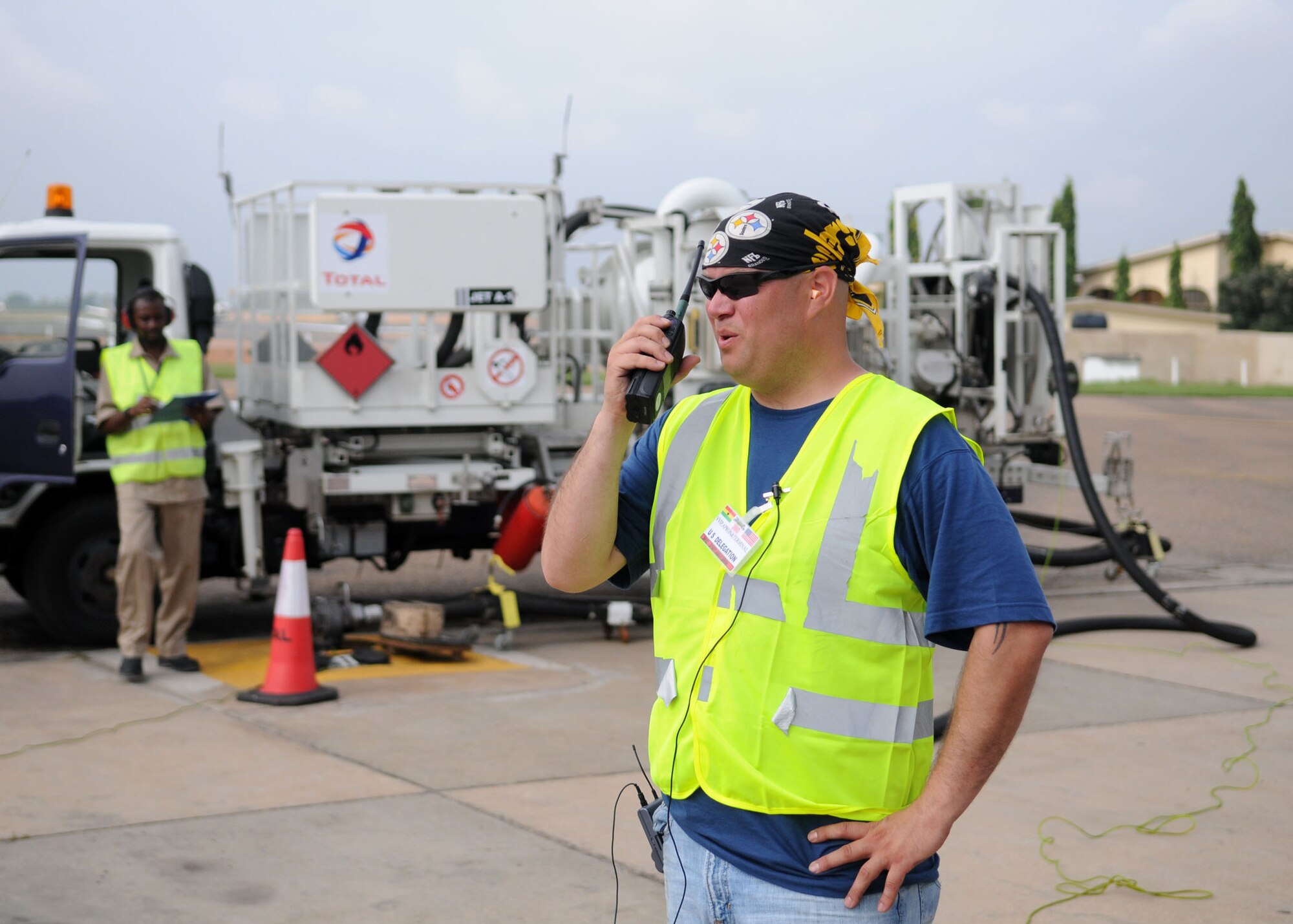Sergeant Duran, the aerial port team chief, and Airman Berglund are among more than 150 Airmen, Sailors and Marines in Ghana and Sailors aboard the USS Iwo Jima who form a task force supporting U.S. President Barack Obama’s visit July 10 and 11. The mission is being conducted by 17th Air Force, also known as Air Forces Africa, at Ramstein Air Base, Germany. Seventeenth Air Force is the air component for U.S. Africa Command. The task force is providing aerial port and aircraft maintenance teams, along with forward communications, early warning and air domain safety and security elements to support the President’s visit, his first to the African continent since taking office in January. In addition to supporting the visit, members are working with their Ghanaian counterparts to strengthen the partnership between the two nations. (U.S. Air Force photo by Staff Sgt. Jerry Fleshman)