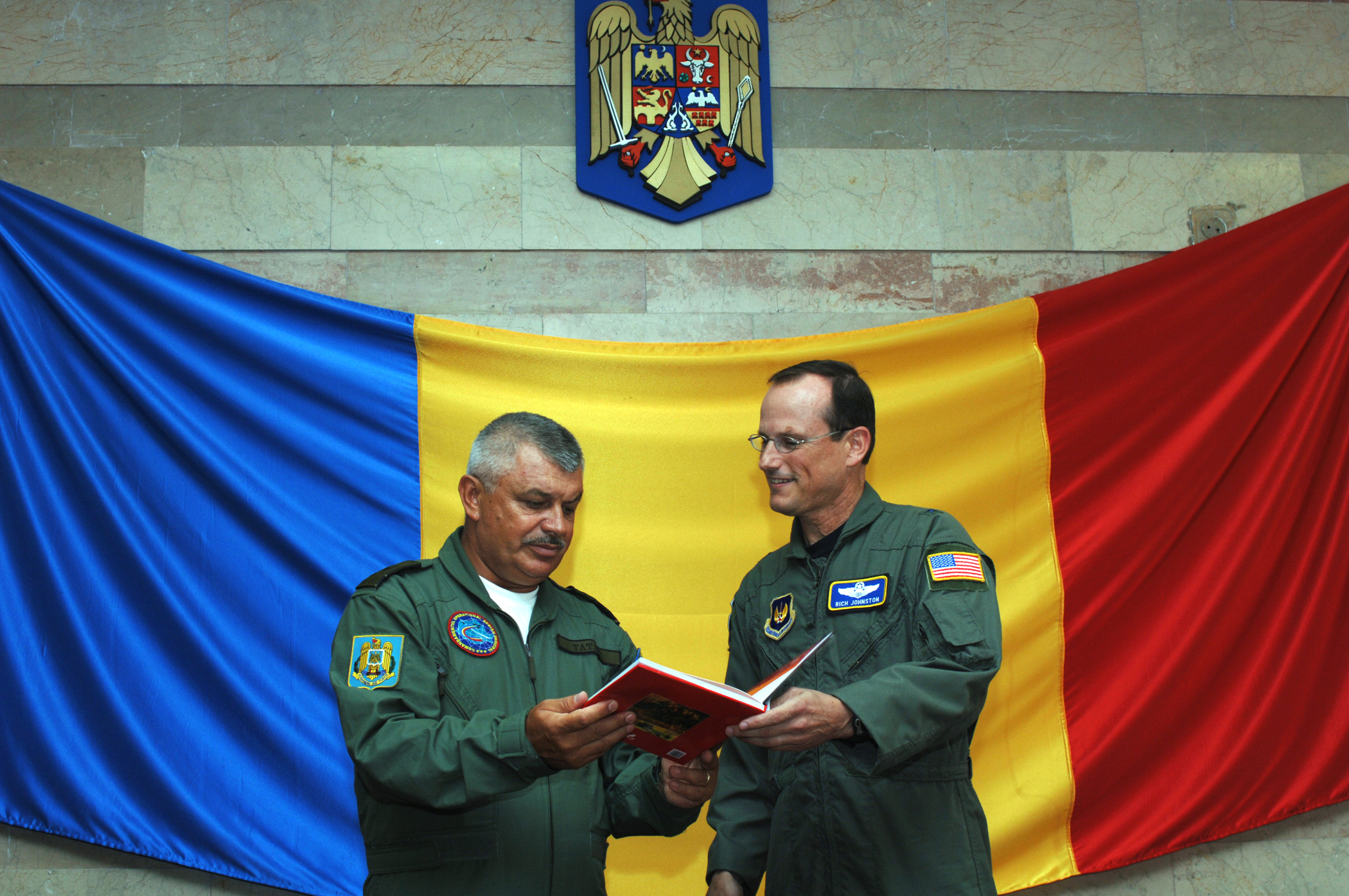 Brig. Gen. Costel Tataru, Romania Air Force Main Air Operational Center deputy commander, and Brig. Gen. Rich Johnston, KMC and 86th Airlift Wing commander, discuss future operations in Romania at Mihail Kogalniceanu Air Base, Romania, July 24. (U.S. Air Force Photo/ MSgt Timothy Cook)