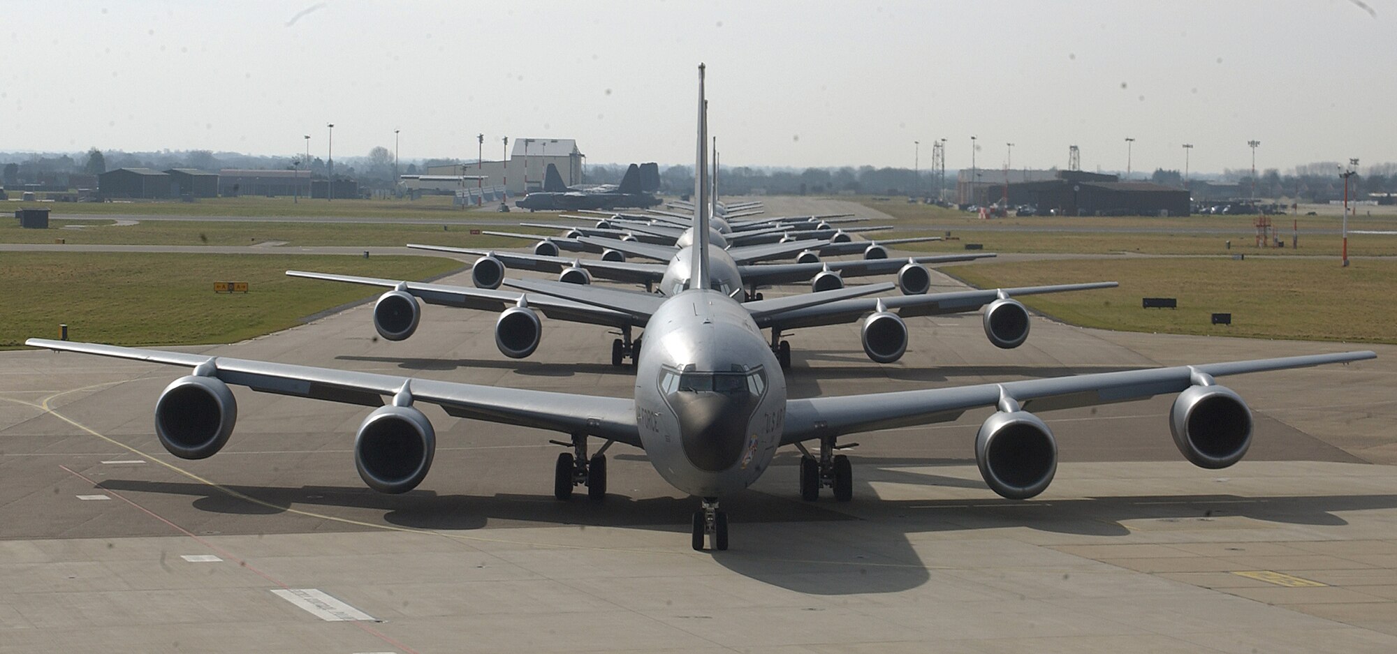ROYAL AIR FORCE MILDENHALL, England – Six KC-135 Stratotankers move on the taxiway as part of a training mission to validate maintenance and operational capabilities. According to regulations and safety reasons, the formation of six is the maximum number of aircraft allowed to take off together. The training mission demonstrated Team Mildenhall’s quick response capability as the only Air Force refueling wing in Europe. (Photo by Staff Sergeant Jeanette Copeland)