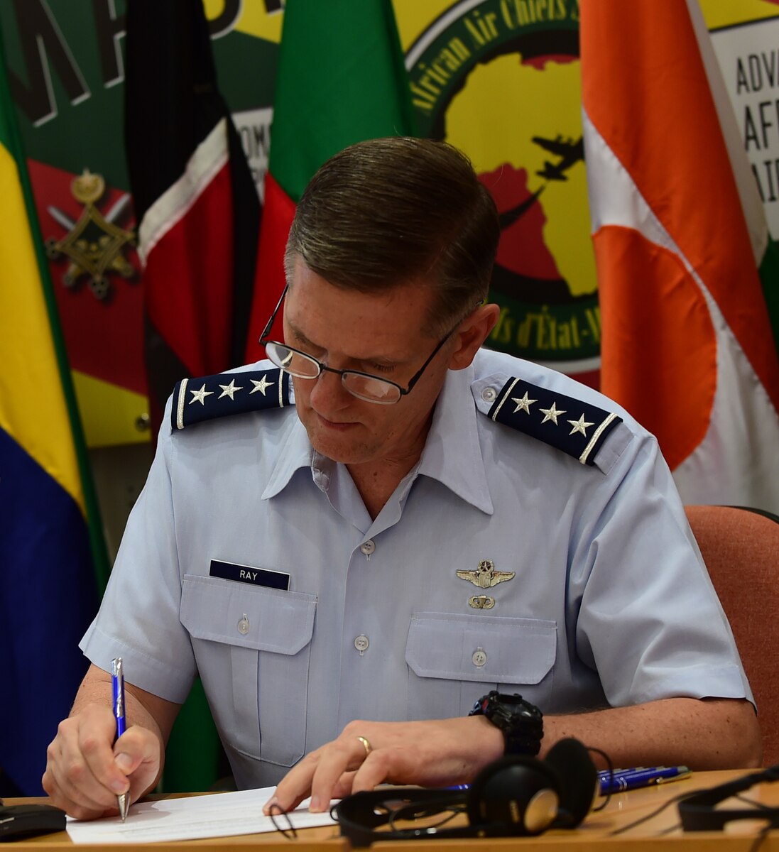 Mauritanian and U.S. leadership participate in the first of the roundtable discussions with the Air Chiefs and their delegates from 18 African nations. The roundtable discussions included peacekeeping operations, countering violent extremist organizations, air force development strategies, airfield security and formalizing a network of African airmen. The 5th Annual African Air Chiefs Symposium, co-hosted by the Mauritanian Air Force and U.S Air Forces Africa took place in Nouakchott, Mauritania, Sept. 14-17, 2015. (U.S. Air Force photo by Master Sgt. Chrissy Best/Released)