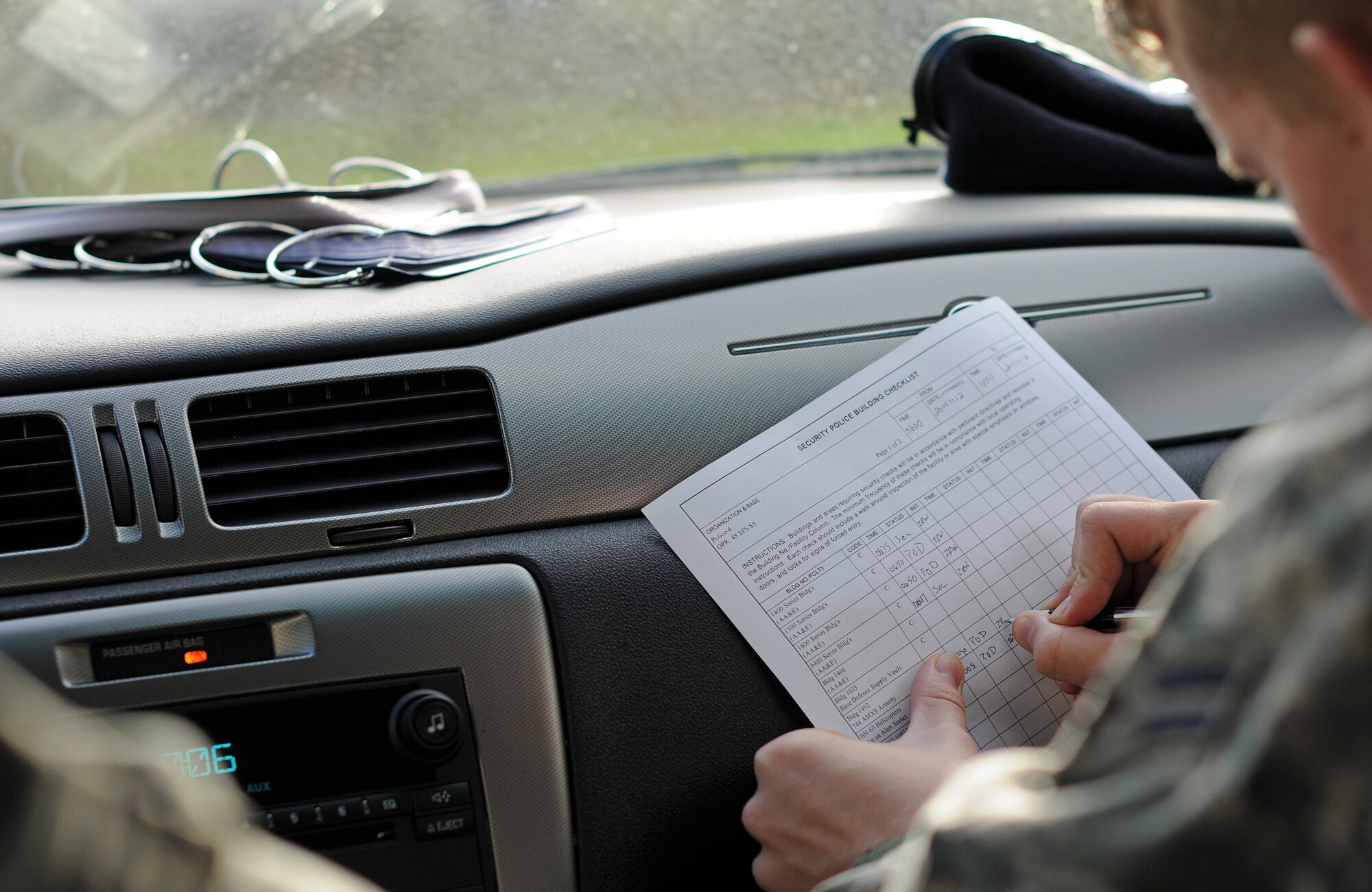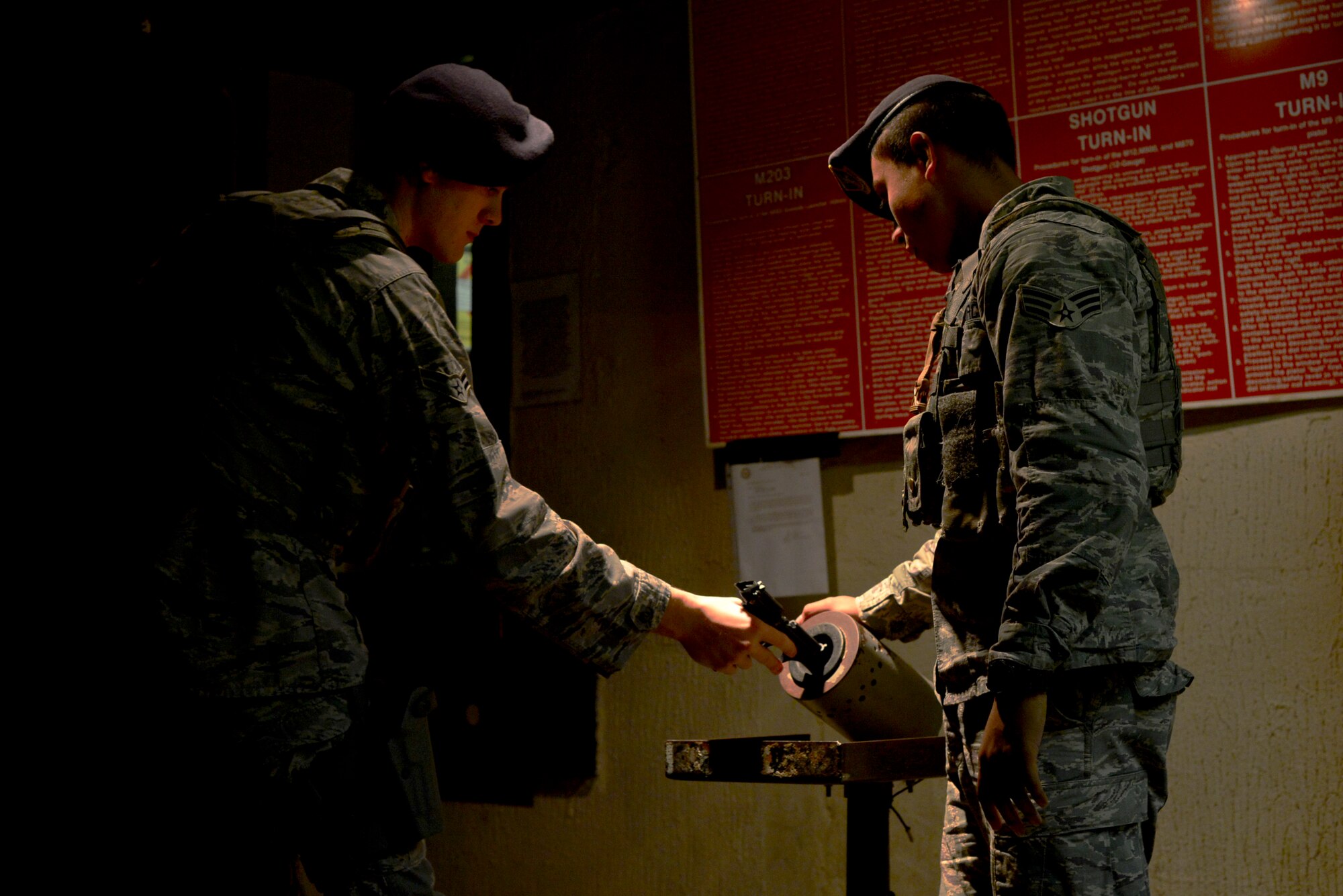 Airman Jordan Williams, 48th Security Forces Squadron response force member, oversees vehicle inspections from the catwalk in the large vehicle inspection site at Royal Air Force Lakenheath, England, Nov. 12, 2014. The LVIS, pronounced “elvis,” is manned by British forces and military police, to ensure optimal security at all times. (U.S. Air Force photo by Senior Airman Erin O’Shea/Released)