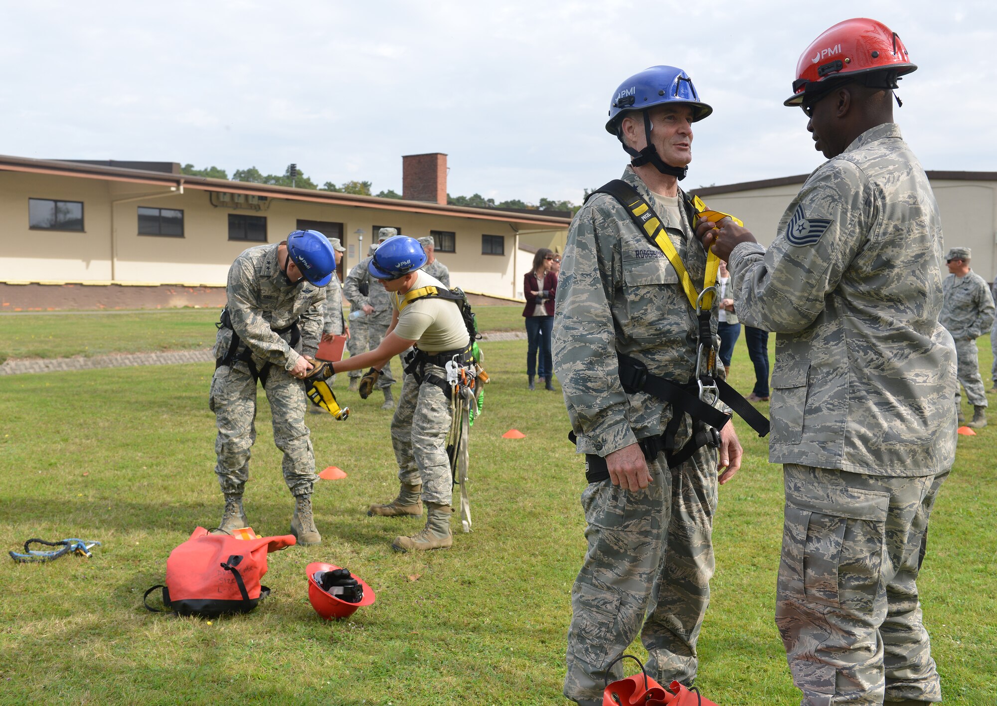 Tech. Sgt. William Liggins, 1st Communications Maintenance Squadron cable antenna systems team lead, helps Lt. Gen. Darryl Roberson, 3rd Air Force and 17th Expeditionary Air Force commander, put on safety equipment before he participates in a simulated rescue mission at a 1st CMXS communication tower during an immersion tour on Ramstein Air Base, Germany, Sept. 30, 2014. During his tour, Roberson learned about the day-to-day tasks of Airmen assigned to multiple units within the wing. The tour helped give him a better understanding of the wing’s operations and how it contributes to the overall Air Force mission in support of combatant commanders and national objectives. (U.S. Air Force photo/Senior Airman Holly Mansfield)