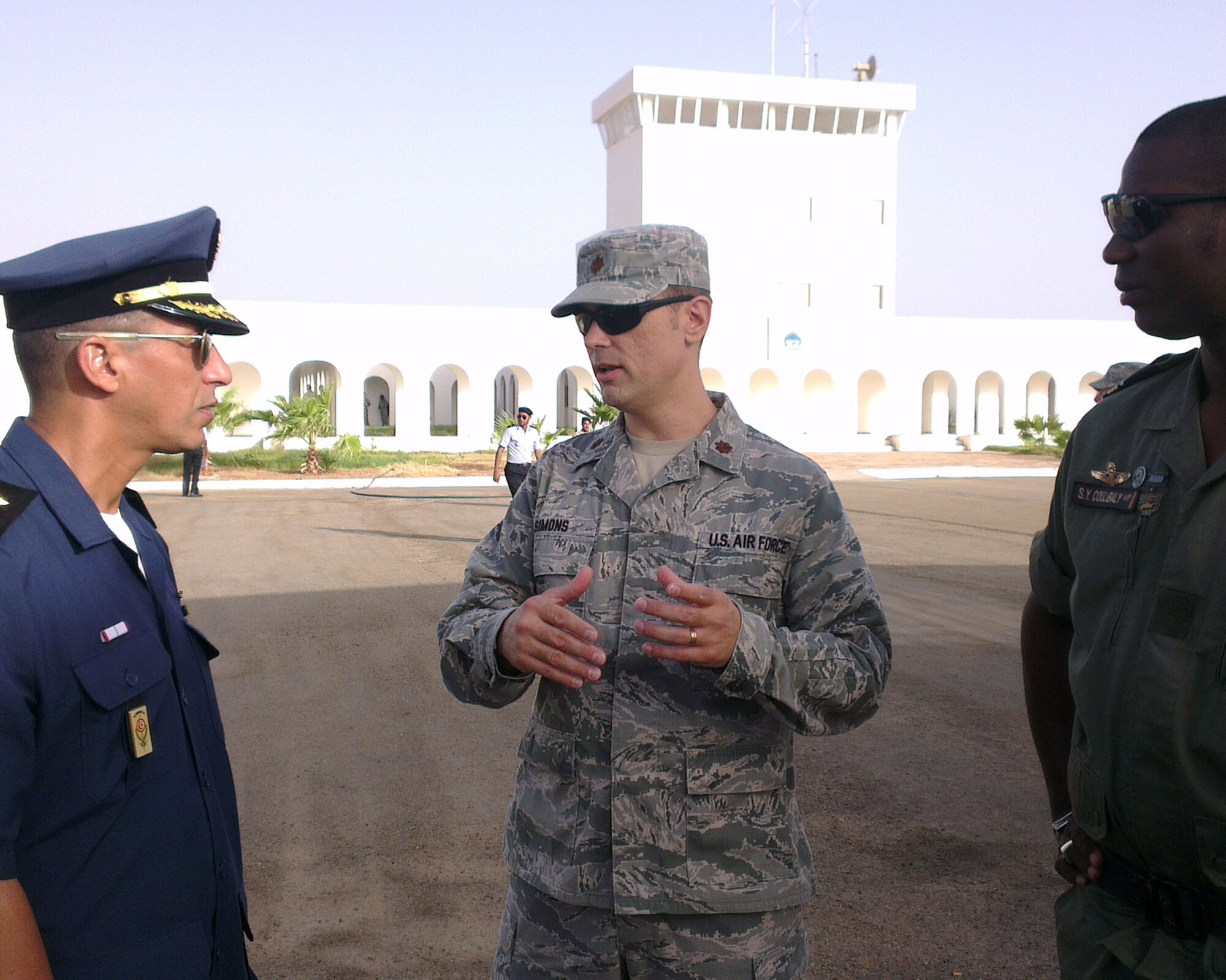 Mauritanian Air Force Captain, Eyoub Teyss, intelligence, surveillance and reconnaissance operations officer, briefs U.S. Air Force Maj. Michael Simons, African Partnership Flight Mauritania lead planner, left, and U.S. Air Force Maj. Steven Payne, ISR instructor, about the ISR capabilities on the Cessna 208 Grand Caravan during a tour of the aircraft at Atar Airbase, Atar, Mauritania, Sept. 1, 2014. The Cessna 208 is the premier aircraft used by the Mauritanian Air Force to ensure safety and security in the region. (U.S. Air Force photo/Master Sgt. Brian Boisvert/Released)