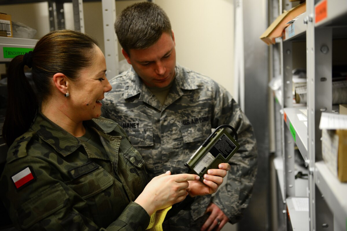 Polish air force Tech. Sgt. Tomasz Kunicki, life support operations flight, showcases aircrew flight equipment and fields questions from U.S. Air Force AFE Airmen, March 20, 2014, at Lask Air Base, Poland. Airmen assigned to Aviano Air Base, Italy, toured AFE facilities in Poland to gain an understanding of the mission, field questions from NATO partners and promote interoperability throughout the ranks. (U.S. Air Force photo/Airman 1st Class Ryan Conroy)