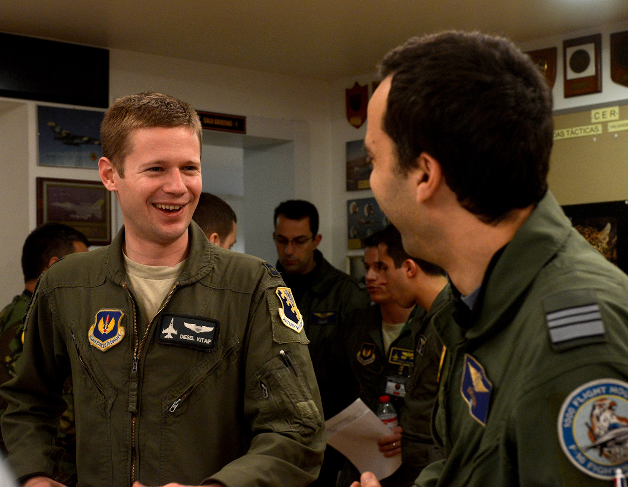 Capt. Michael Piazza, 555th Fighter Squadron F-16 Fighting Falcon pilot, briefs Capt. Rui Silva, a Portuguese C-130 Hercules pilot, Feb. 12, 2014 for an upcoming large force exercise mission at Monte Real Air Base, Portugal. Comparable to Operation Red Flag hosted at Nellis Air Force Base, Nevada, REAL THAW 14 will attract approximately 4,000 military personnel and 44 aircraft from the U.S., Netherlands, Portugal and NATO. (U.S. Air Force photo/2nd Lt. Allie Delury)