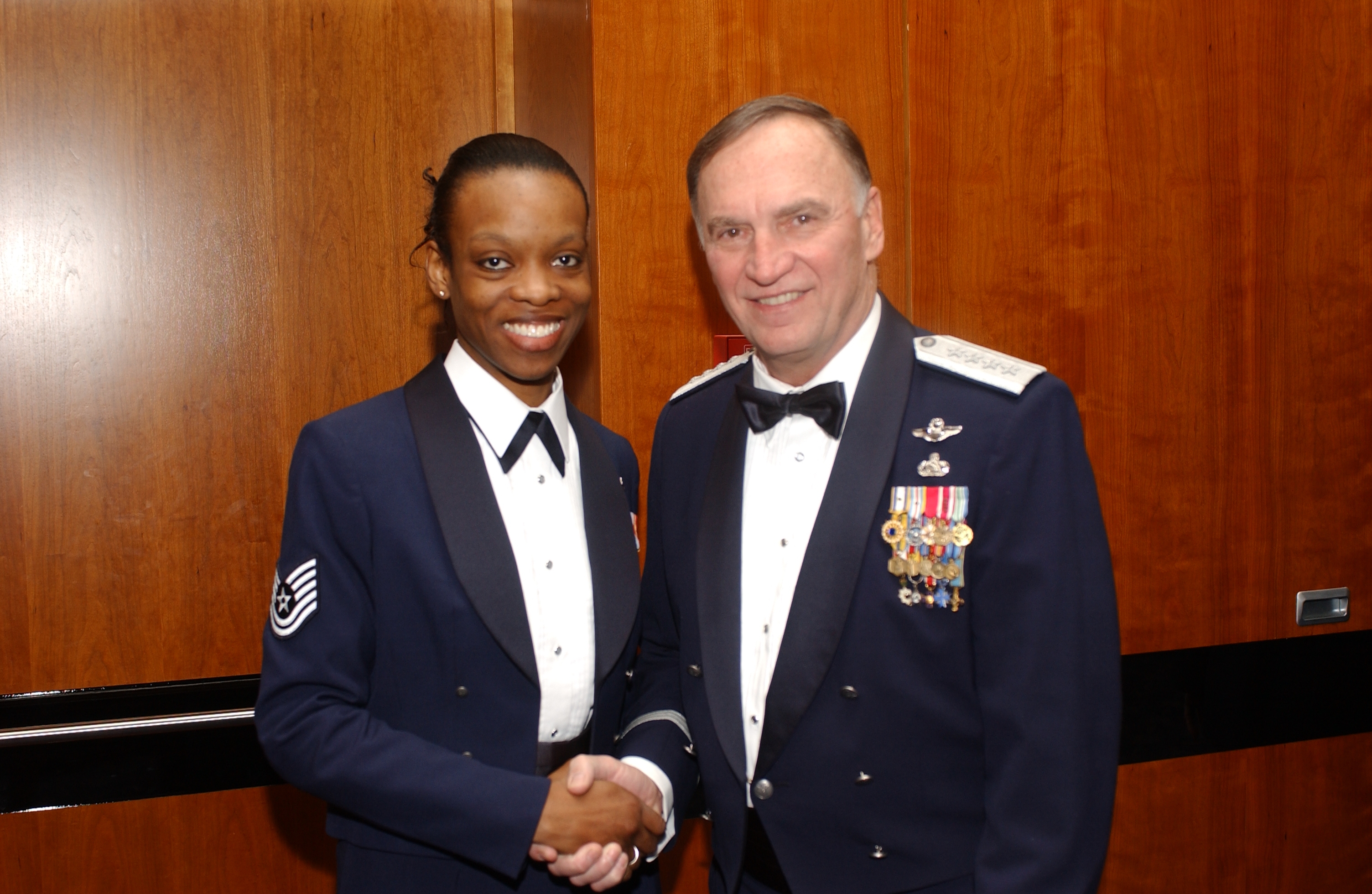 SPANGDAHLEM AIR BASE, Germany -- Gen. Tom Hobbins, U.S. Air Forces in Europe commander (l) and and Chief Master Sgt. Gary Coleman, USAFE command chief master sergeant (r) presents 52nd Fighter Wing Honorguardsman of the Year trophy to A1C Joshua A. Vanderbeck, 52nd Aircraft Maintenance Squadron, during the 52nd Fighter Wing Annual Awards Banquet here Feb. 25.