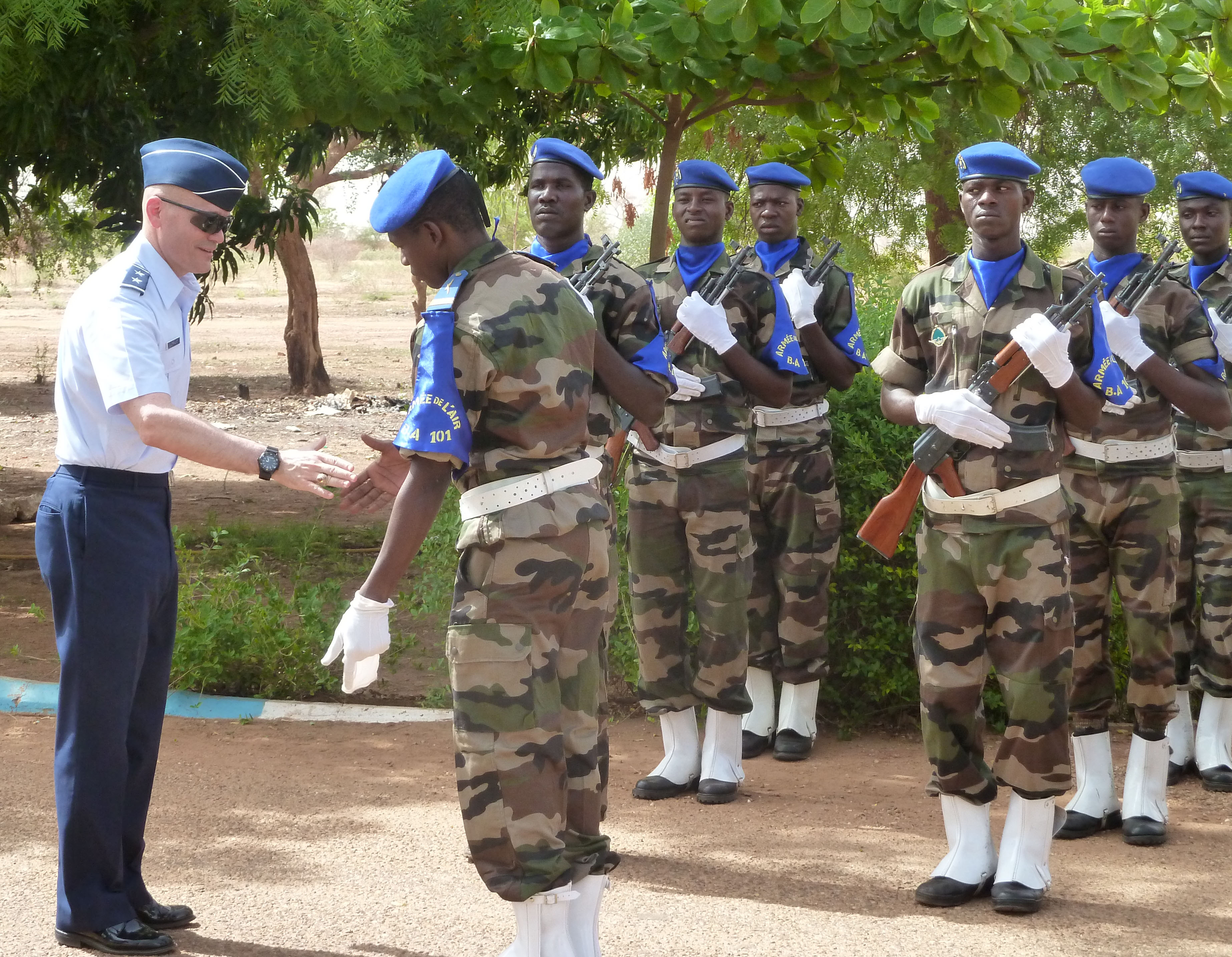 Members of the Nigerien air force greet U.S. Air Force Maj. Gen. Carlton D. Everhart II during a pass and review ceremony on his visit to Base Aerienne 101 in Niamey, Niger, April 29, 2013. Everhart visited with Nigerien senior military leaders and airmen to exchange techniques and ideas on strengthening partnership capacities between the two air forces. (U.S. Air Force photo by Capt. Reba Good/Released)