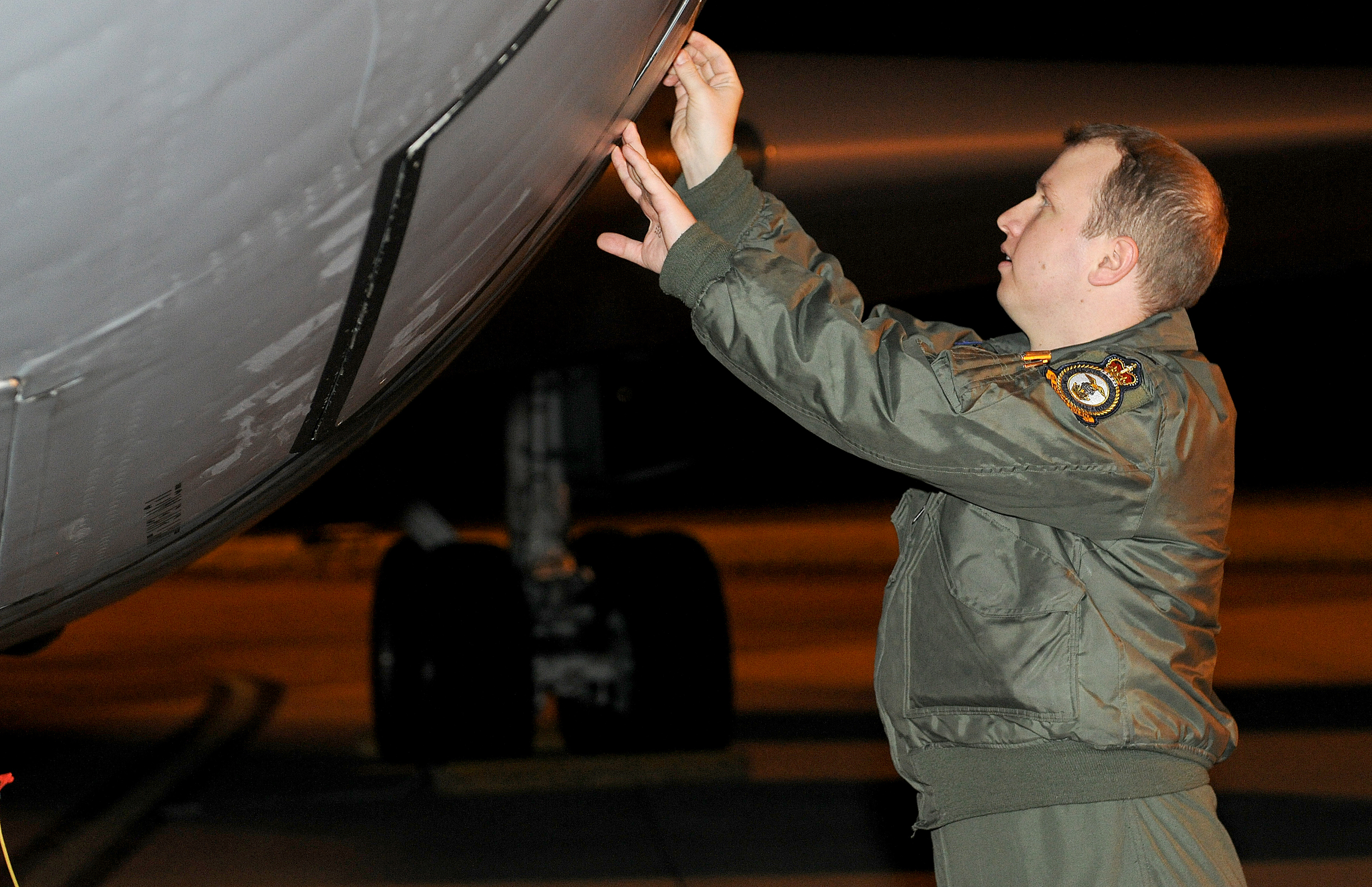 RAF MILDENHALL, England -- A crew member from the 351st Air Refueling Squadron removes an inspection seal from a KC-135 Stratotanker before boarding for a refueling mission in support of Joint Task Force Odyssey Dawn. JTF Odyssey Dawn is the U.S. Africa Command task force established to provide operational and tactical command and control of U.S. military forces supporting the international response to the unrest in Libya and enforcement of United Nations Security Council Resolution (UNSCR) 1973. UNSCR 1973 authorizes "all necessary measures" to protect civilians in Libya under threat of attack by Gadhafi regime forces. JTF Odyssey Dawn is commanded by U.S. Navy Admiral Sam Locklear. (U.S. Air Force photo by Senior Airman Tabitha M. Lee)