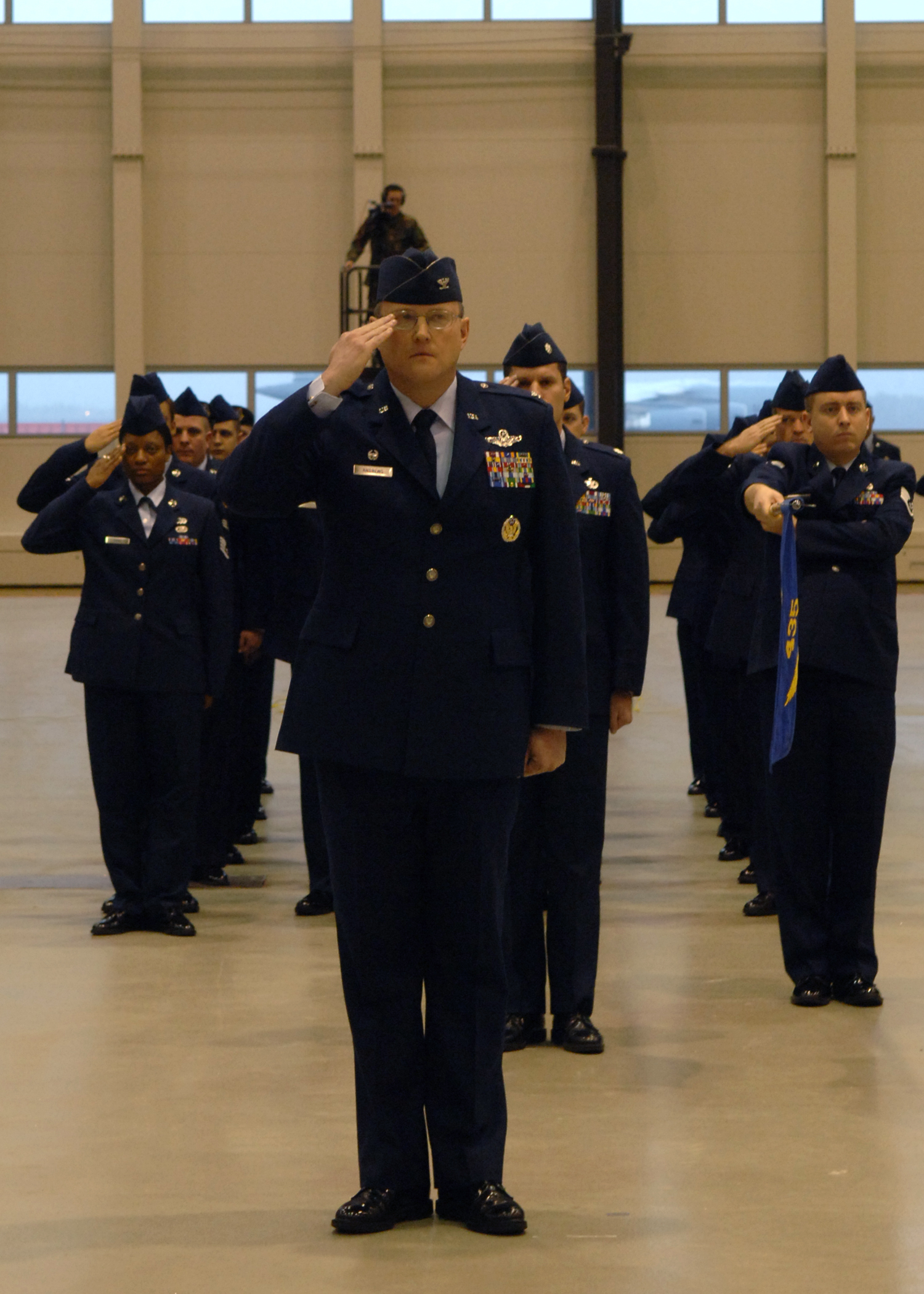 Members of the 435th Mission Support Group salute USAFE commander Gen. William T. Hobbins during his retirement ceremony, Dec. 10, Ramstein Air Base, Germany. Gen. Hobbins retired after more than 38 years of service. (U.S. Air Force Photo by Airman 1st Class Kelly LeGuillon)