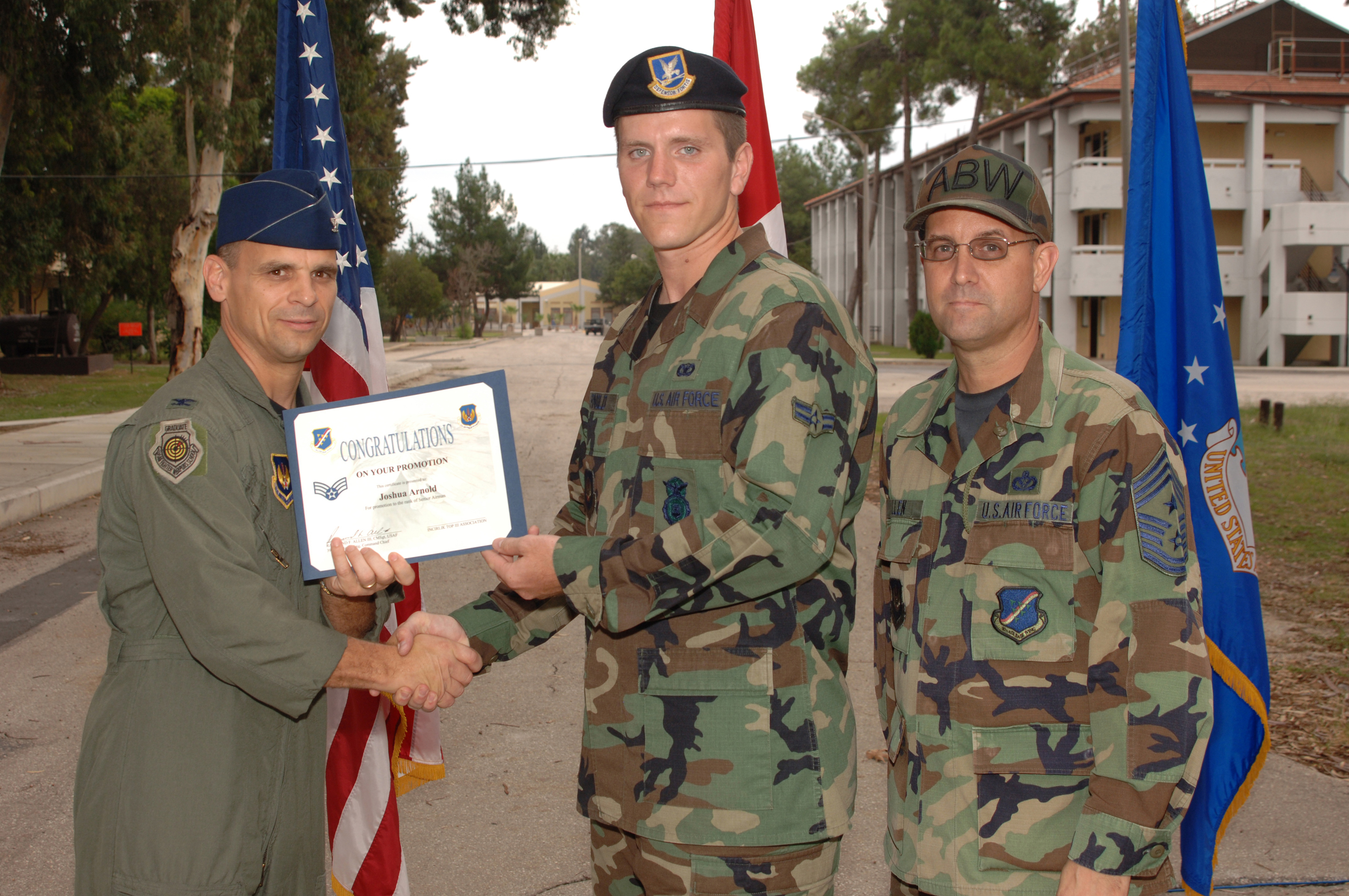 INCIRLIK AIR BASE, Turkey -- Col. Kenneth Stefanek, (left) 39th Air Base Wing vice commander and Chief Master Sgt. Raymond Allen, (right) 39th Air Base Wing command chief, promote Airman First Class Joshua D. Arnold to the rank of Senior Airman Sept. 30. Airman Arnold is a member of the 39th Security Forces Squadron and was recently awarded Senior Airman Below the Zone. (U.S. Air Force Photo by Airman First Class Nathan W. Lipscomb)
