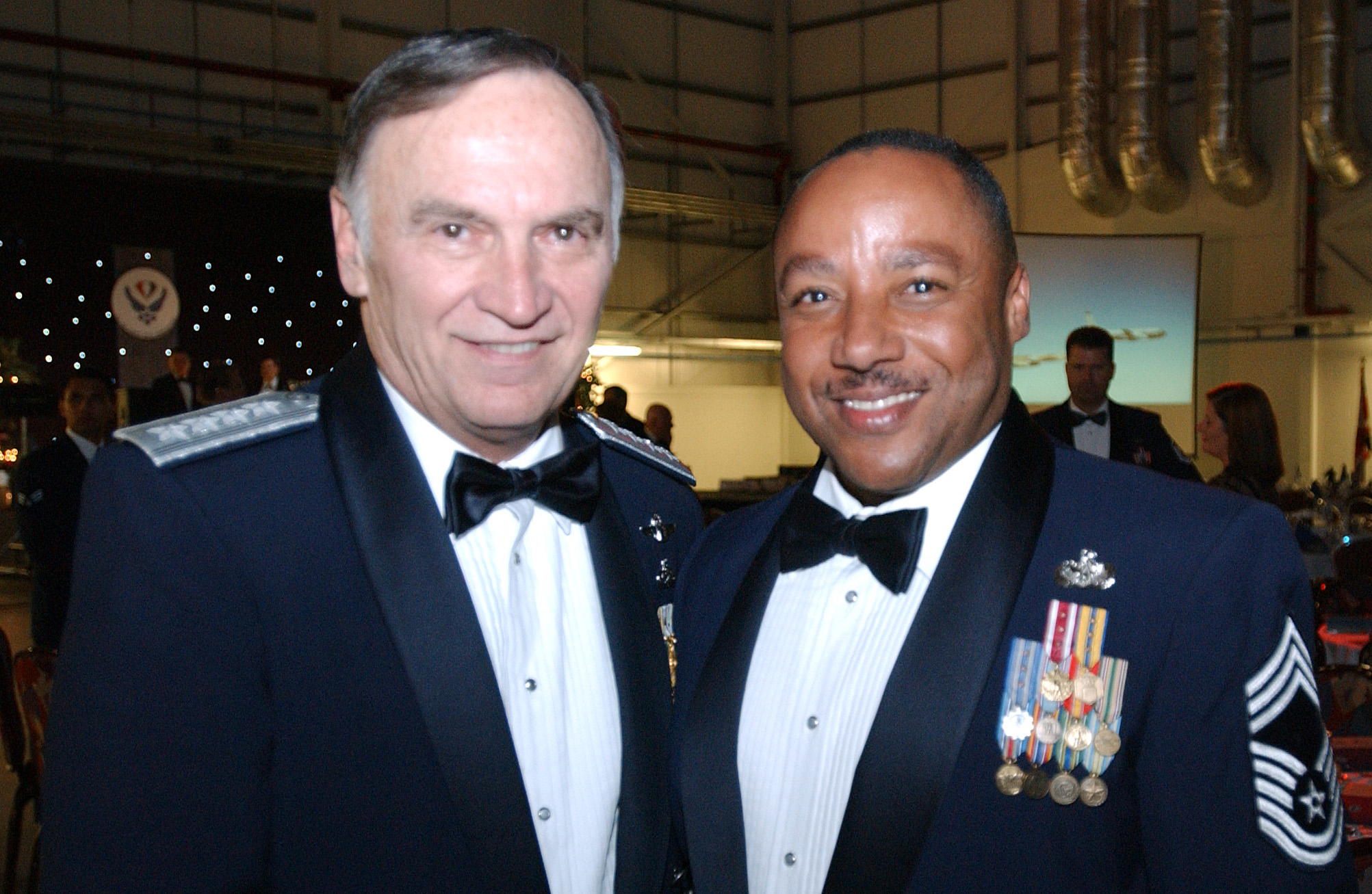 RAF MILDENHALL, ENGLAND – Gen. William T. Hobbins, left, USAFE commander, takes a photo with Chief Master Sgt. Bruce Bulluck, acting command chief, 100th ARW, and Chief Master Sgt. Gary G. Coleman, far right, USAFE command chief, during the Air Force Ball here, Sept. 9, 2006.