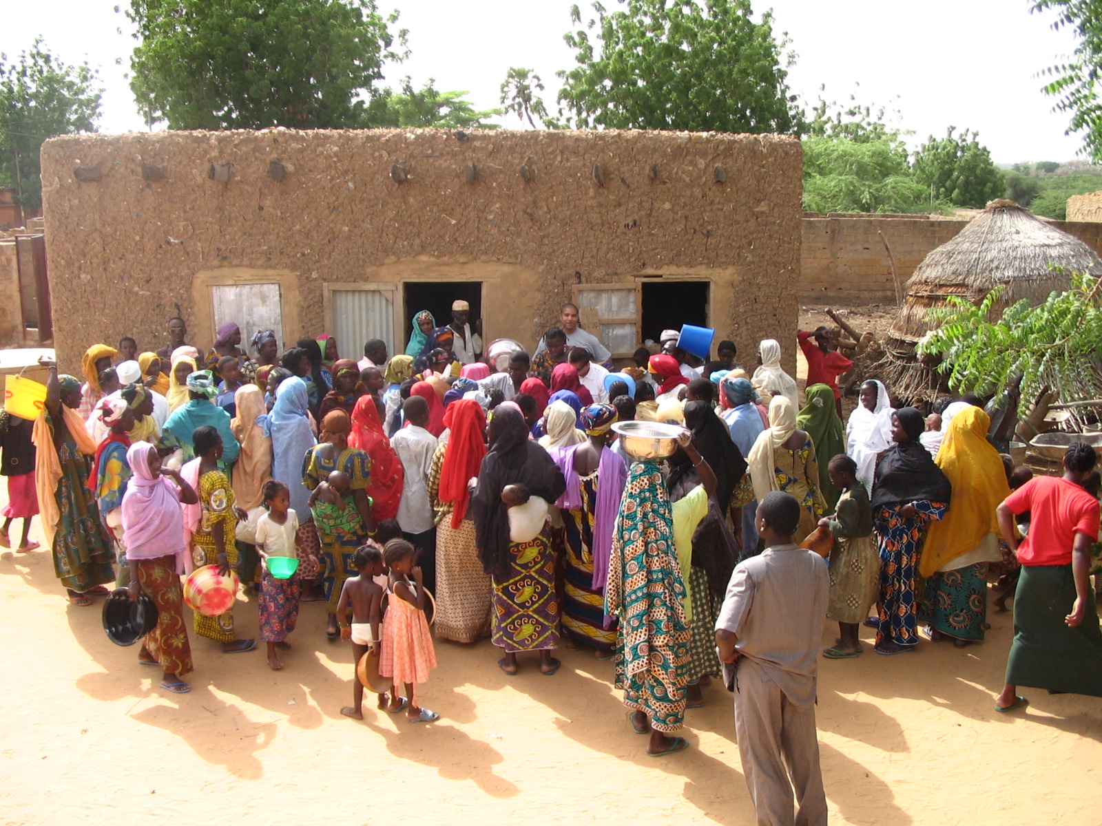 Village people from Karadje, Niger, gather around members from the 787th Air Expeditionary Squadron in July as the Ramstein-based Airmen pass out 1,000 pounds of rice they purchased from their own pockets. The 14-person team is deployed to Niger in support of Eagle Vision, a mission to download satellite imagery for map-making purposes.