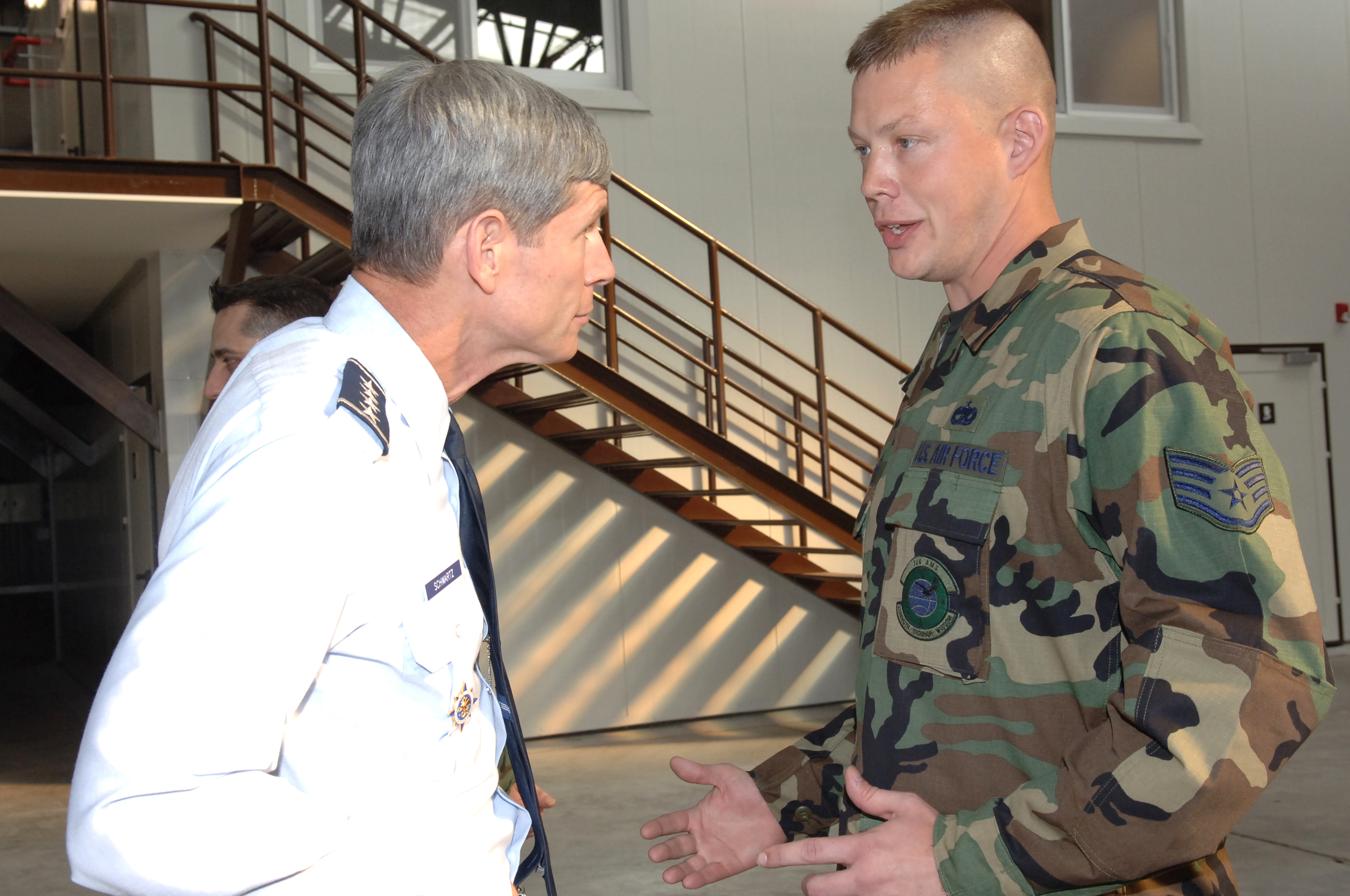 INCIRLIK AIR BASE, Turkey -- Gen. Norton A. Schwartz, left, U.S. Transportation Command commander, talks with Staff Sgt. John Overturf, 728th Air Mobility Squadron member, during his visit to the base June 14. (U.S. Air Force photo by Master Sgt. Bill Gomez)
