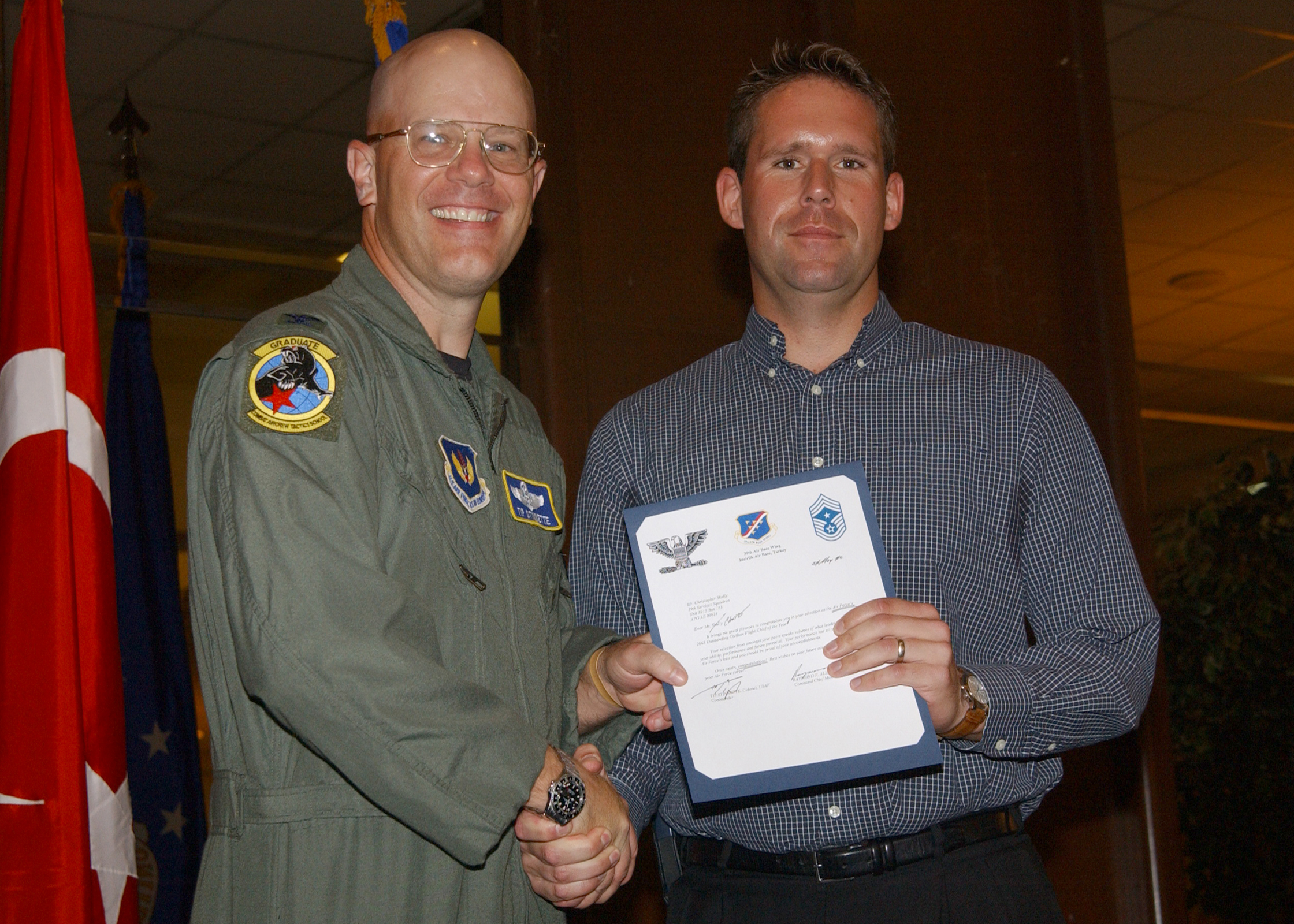INCIRLIK AIR BASE, Turkey -- Col. Murrell "Tip" Stinnette, left, 39th Air Base Wing commander, recognizes Mr. Christopher Skully, for receiving the United Air Forces Service's Civilian Flight Chief of the Year during the monthly promotion ceremony at the consolidated club on May 31. (U.S. Air Force photo by Airman Kelly L. Flynn)