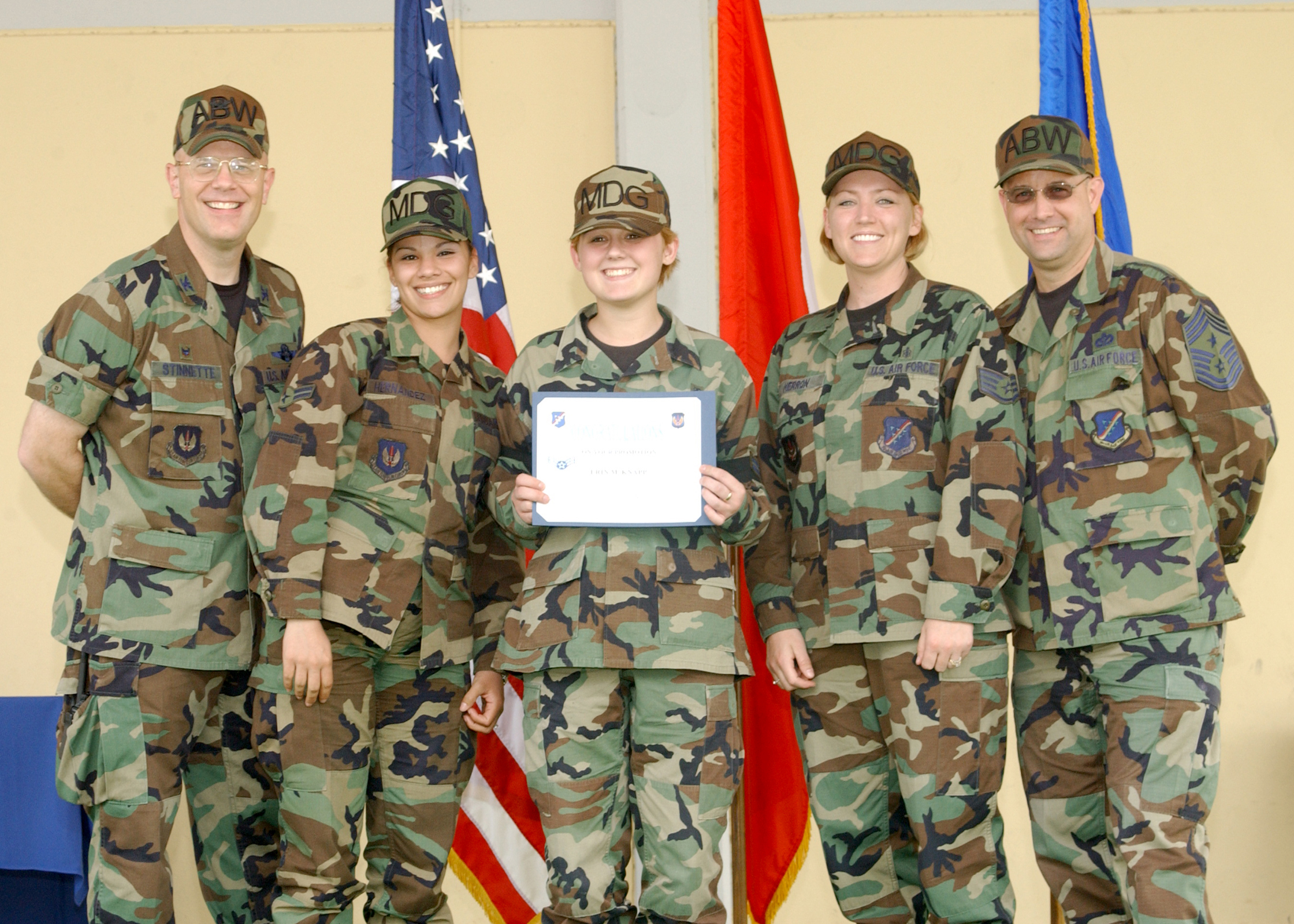 INCIRLIK AIR BASE, Turkey -- Airman Erin M. Knapp, (middle) 39th Air Base Wing medical technician, gets promoted to Airman First Class by Col. Murrell "Tip" Stinnette, (far left) 39th Air Base Wing commander, and Chief Master Sgt. Raymond Allen, (far right) 39th Air Base Wing command chief master sergeant, during the monthly promotion ceremony at Arkadas Park March 31. (U.S. Air Force photo by Airman First Class Tiffany A. Colburn)