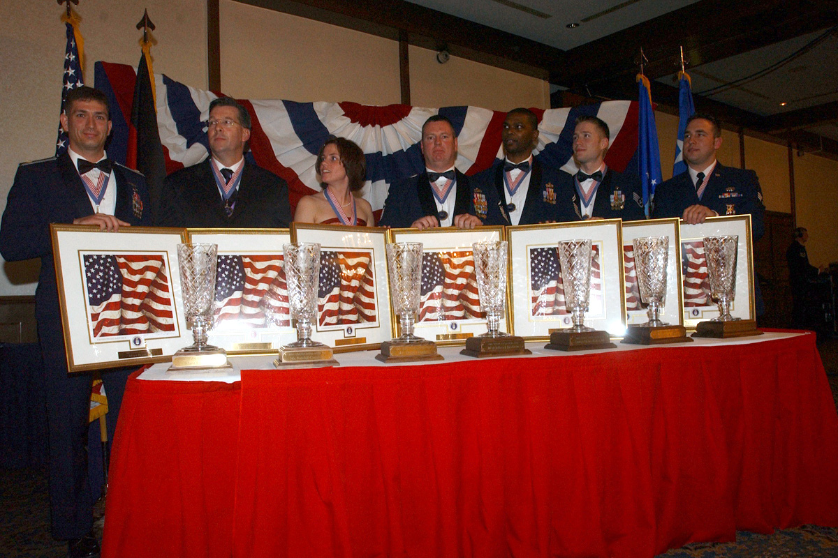 Maj. Bryan Tash, 16 AF 2nd Air Support Operations Squadron ( left), Randall Cummins, 39th Contracting Squadron, Heather Hughes, 52nd Medical Operations Squadron, Master Sgt. Jeffrey Jacobson, 31st Aircraft Maintenance Squadron,Senior Master Sgt. Henry Parker III, 65th Services Squadron, Staff Sgt. Joseph Berberich, 48th Medical Support Squadron and Senior Airman Christopher Gerdes, 435th Civil Engineer Group received top honors at the USAFE 2005 Outstanding Airmen of the Year banquet March 24.