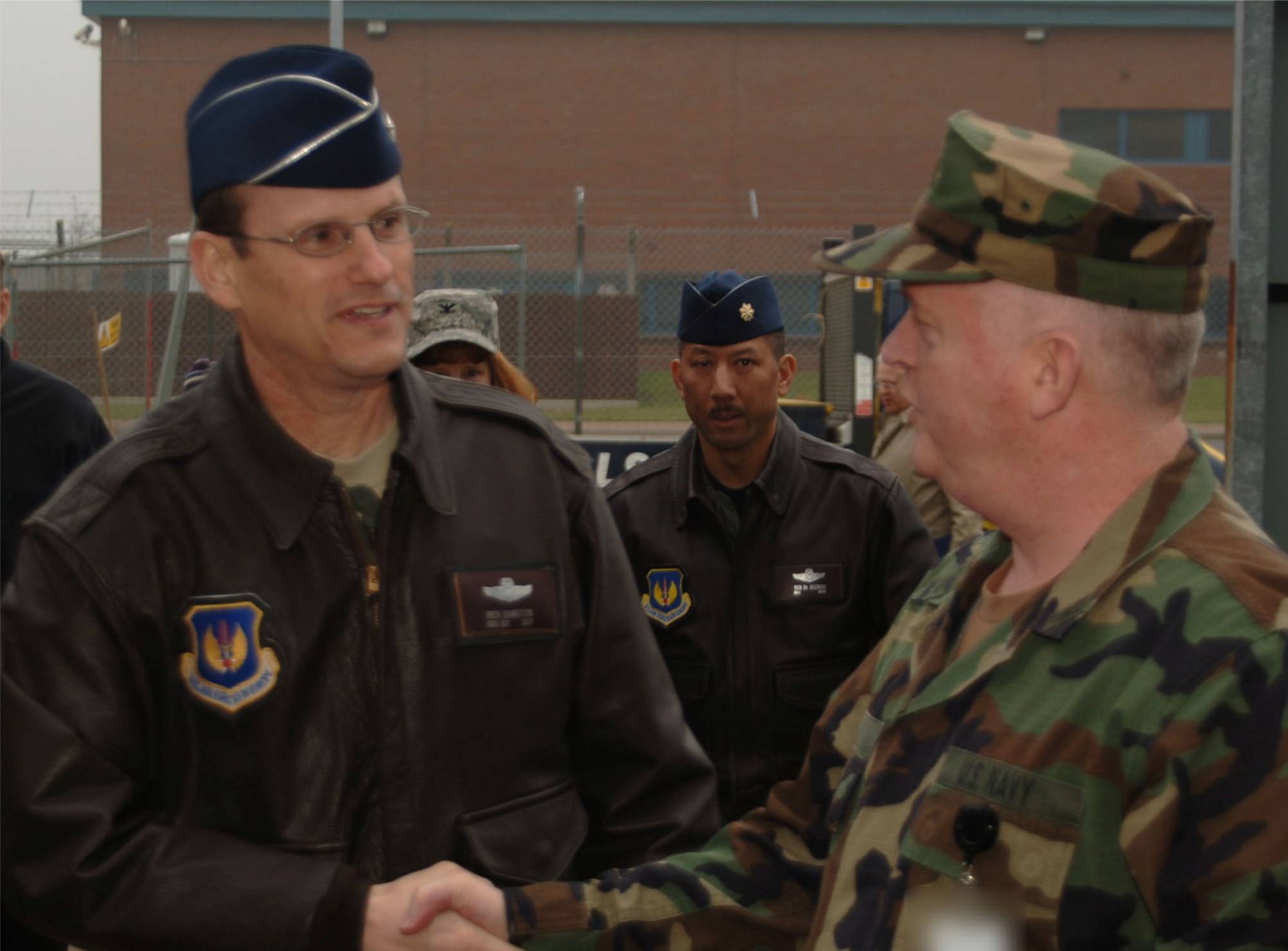 Air Force Brigadier General Richard C. Johnston, Director, Plans, Programs, and Analyses, U.S. Air Forces in Europe is welcomed to the JIOCEUR Joint Analytic Center February 20th by Navy Captain Harry Babin, JAC Deputy Commander. The General visited RAF Molesworth as part of his orientation to USAFE and USAFE supported units in the United Kingdom. (U.S. Air Force Photo by Staff Sgt.Jocelyn L. Rich)
