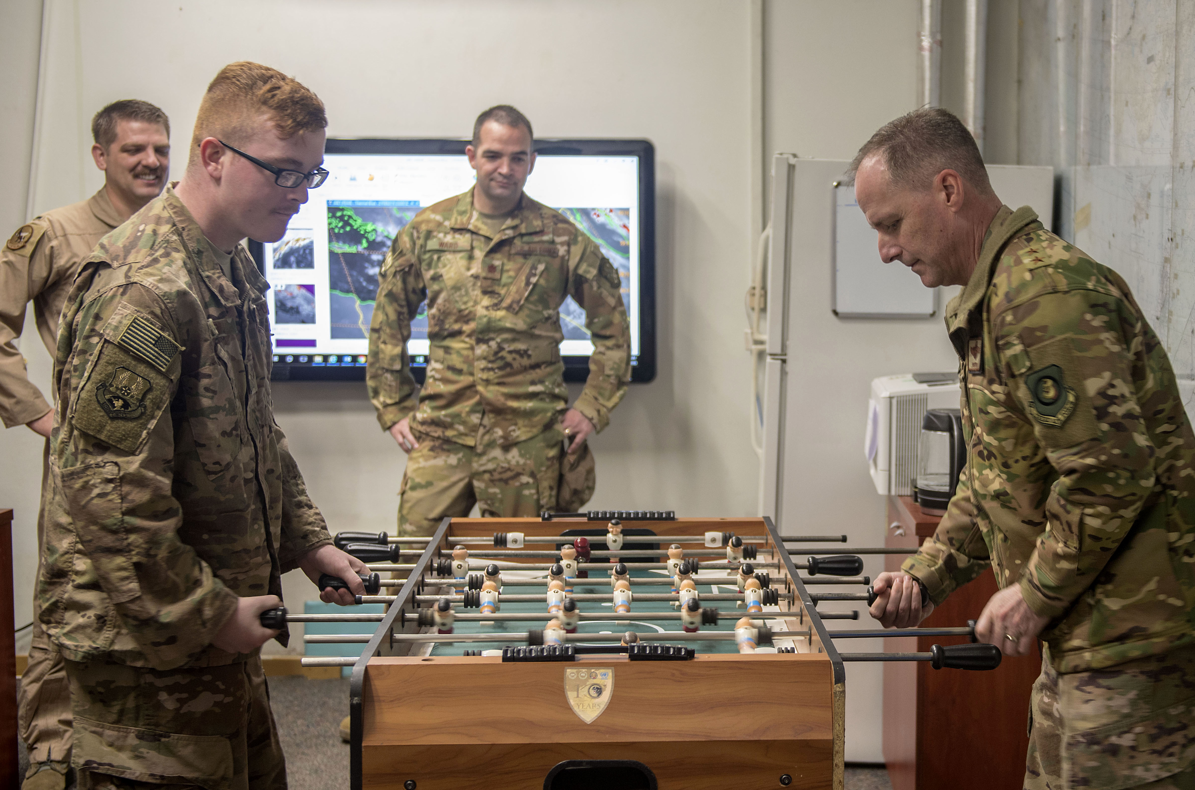 U.S. Air Force Maj. Gen. John M. Wood, Third Air Force commander, and Senior Airman David Alley, 22nd Expeditionary Air Refueling Squadron weather forecaster, play foosball after an immersion briefing at Incirlik Air Base, Turkey, Feb. 22, 2019. The 22nd EARS, a deployed unit at Incirlik comprised of active duty, Air National Guard and Air Force Reserve personnel, maintain and operate KC-135 Stratotankers to provide fuel to aircraft in the U.S. Central Command area of responsibility. (U.S. Air Force photo by Staff Sgt. Trevor Rhynes)