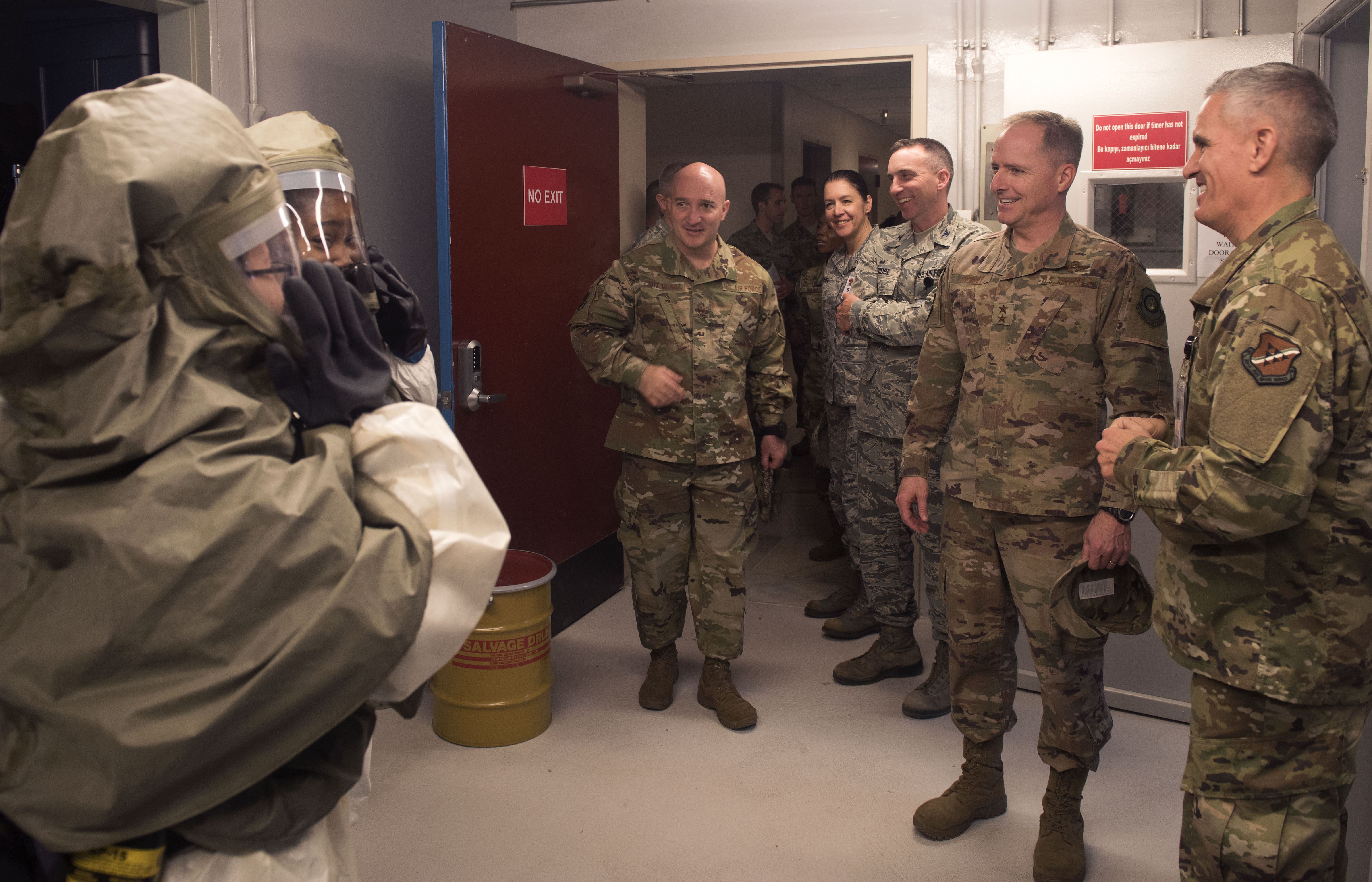 Airmen from the 39th Medical Group demonstrate decontamination procedures during a familiarization briefing with U.S. Air Force Maj. Gen. John M. Wood, Third Air Force commander, at Incirlik Air Base, Turkey, Feb. 22, 2019. Medical Airmen train to improve processes and ensure readiness. (U.S. Air Force photo by Staff Sgt. Trevor Rhynes)