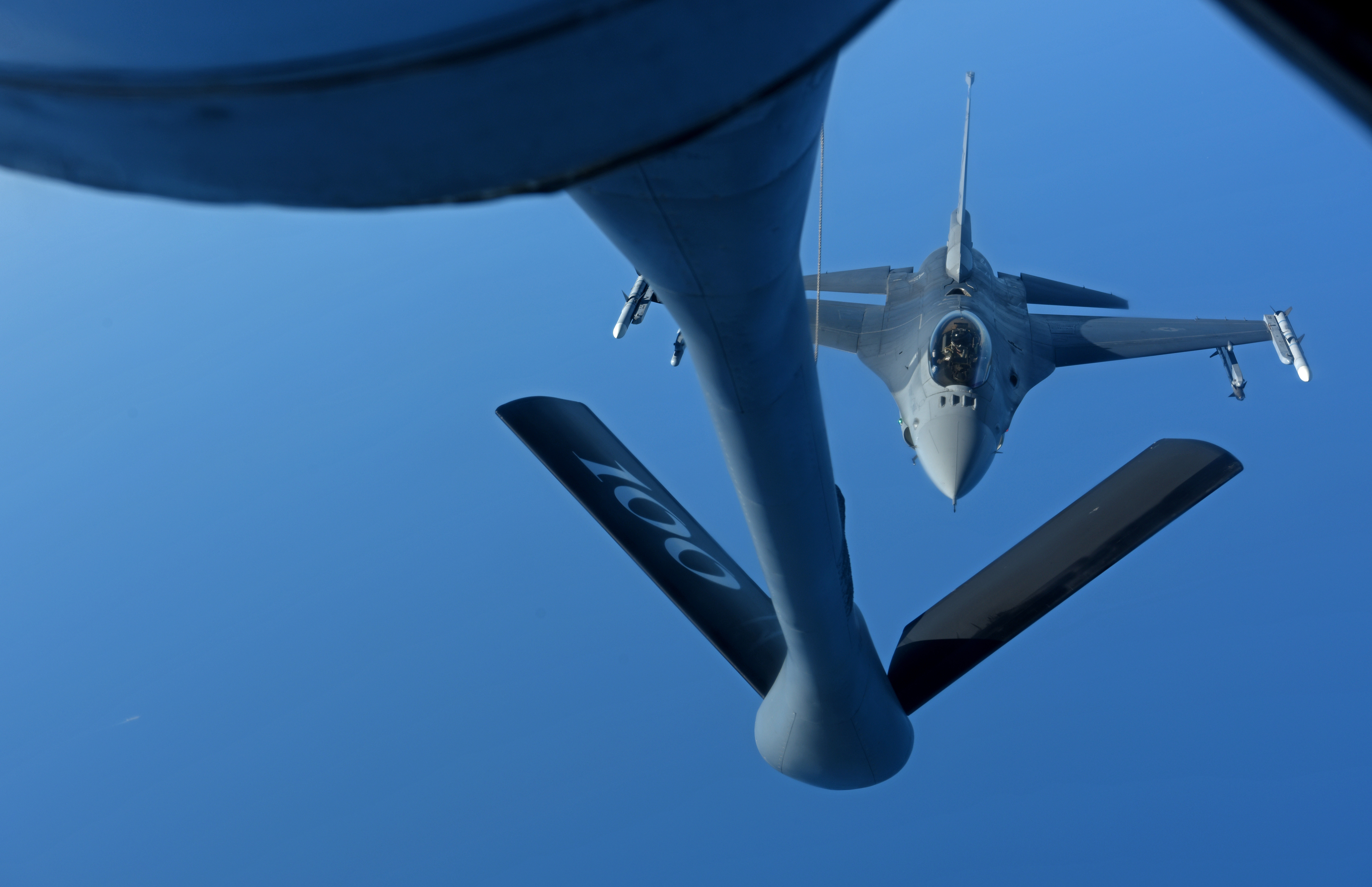 A U.S. Air Force F-16 Fighting Falcon from the 457th Fighter Squadron, Fort Worth, TX, prepares to receive fuel from a 100th Air Refueling Wing KC-135 Stratotanker from RAF Mildenhall, England, during exercise Astral Knight over the skies of Italy, June 3, 2019. AK19 is a joint, multinational exercise which aims to demonstrate the integration, coordination, and interoperability of joint existing command and control at the operation and tactical levels. (U.S. Air Force photo by Airman 1st Class Brandon Esau)