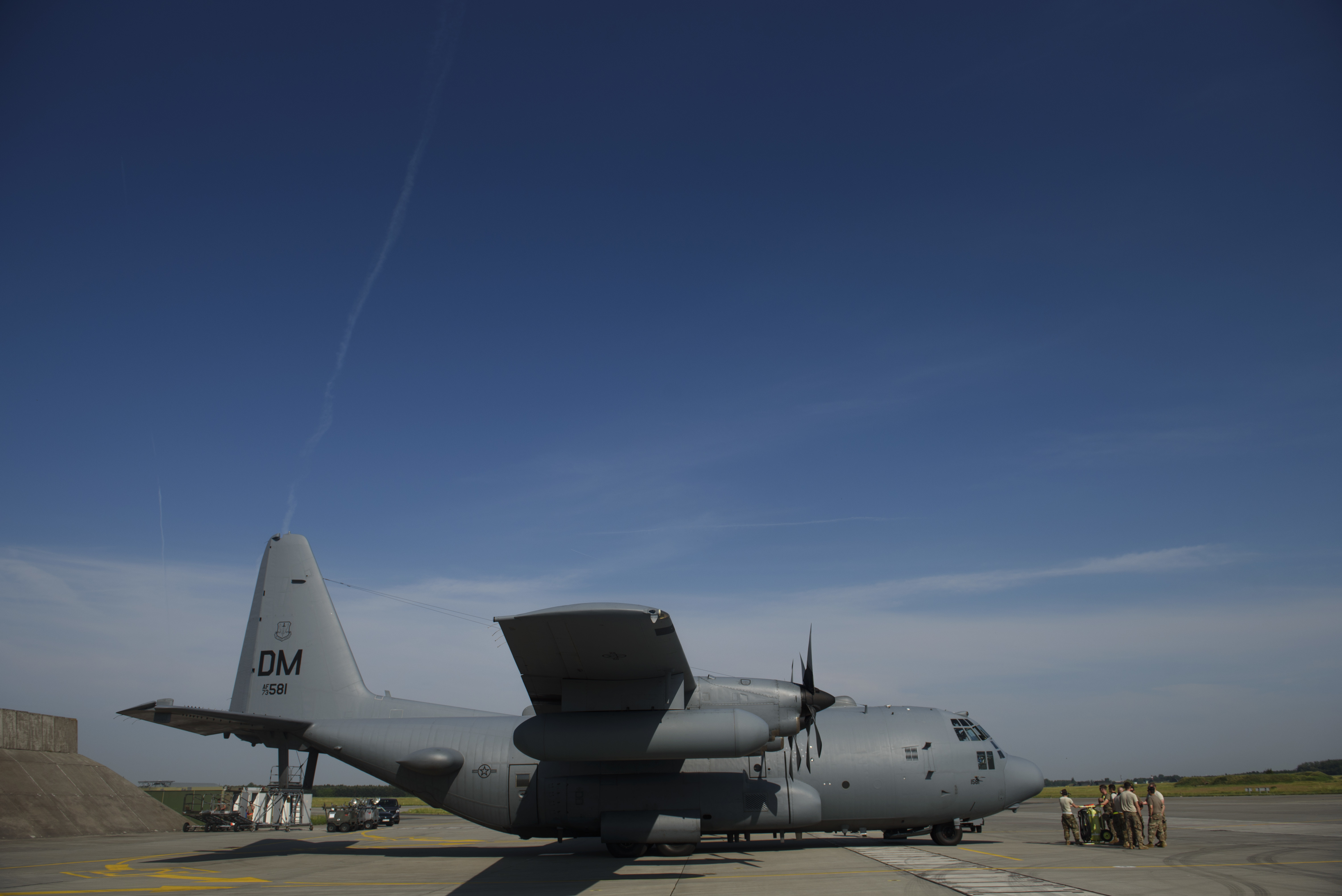 Maintenance Airmen wait for the aircrew to start engines on an EC-130H Compass Call during Aviation Rotation 19-2 at Krzesiny Air Base, Poland, June 12, 2019. This exercise provides bilateral training designed to enhance partner interoperability, maintain joint readiness and assure regional allies. (U.S. Air Force photo by Staff Sgt. Jonathan Snyder)