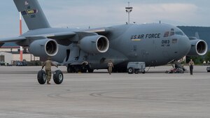 U.S. Air Force Airmen and U.S. Army Soldiers work together to provide evacuees with level-one patient care, Aug. 25, 2021, at Ramstein Air Base, Germany. Level-one patient care includes patients requiring higher levels of care, whose needs can be met with advice and support from the critical care