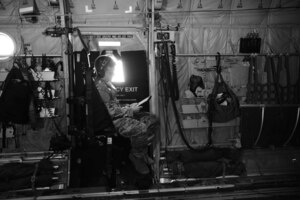 U.S. Air Force Airman 1st Class Benjamin Pall, 75th Air Expeditionary Squadron loadmaster, review his manual for a C-130J Super Hercules, East Africa, Djibouti, Feb. 17, 2019. The 75th EAS provides tactical airlift to support and sustain units across Africa. (U.S. Air Force photo by Tech. Sgt.